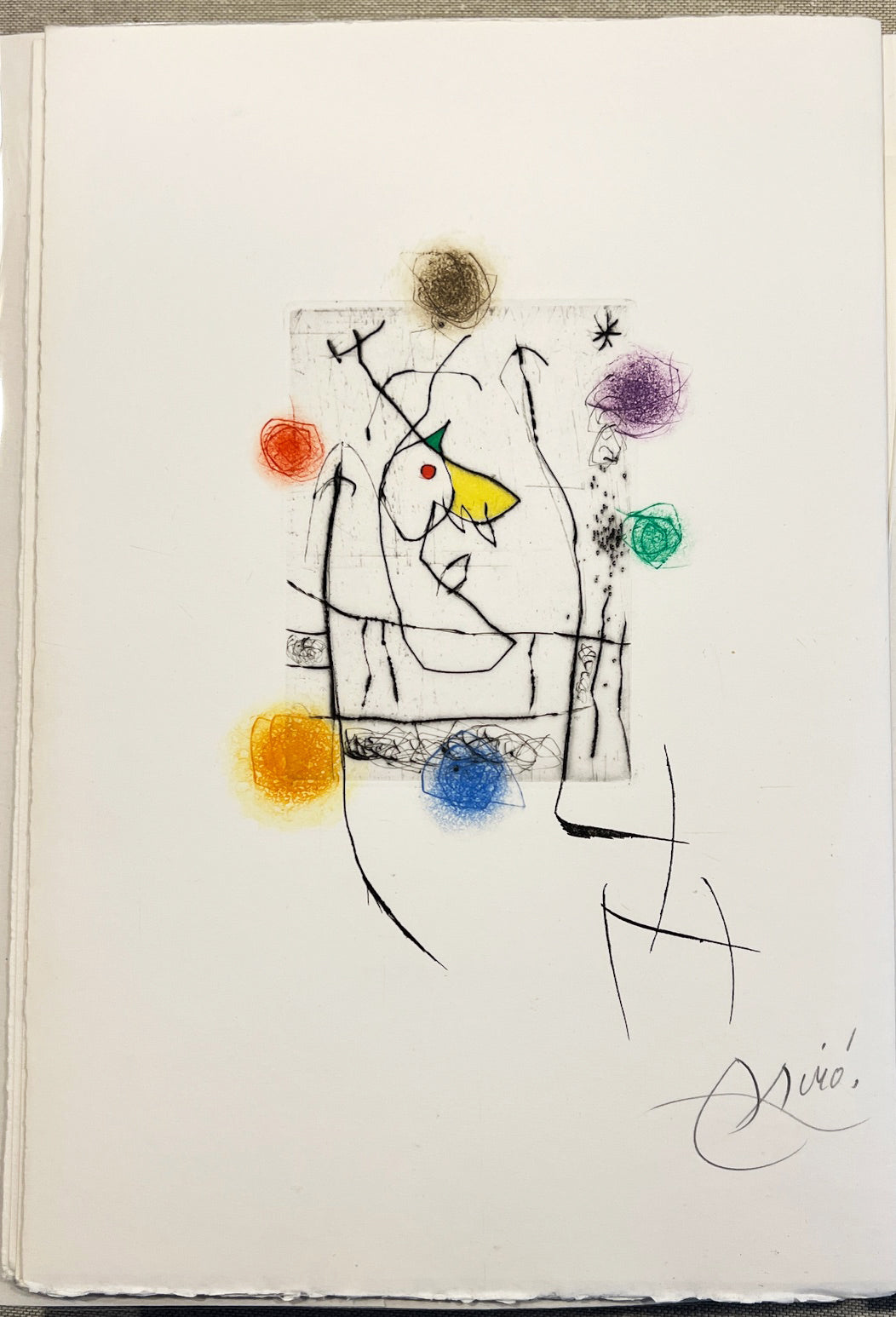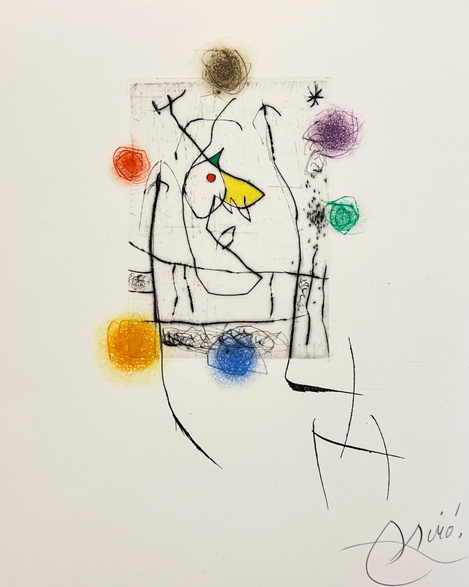Joan Miro was born April 20, 1893 in Barcelona, Spain. Like Pablo Picasso, Henri Matisse, and Salvador Dali, Miro is one of the great pioneers of twentieth-century art. Miro began drawing at a young age, and his choice of subjects -tufts of grass, insects, birds- revealed an early affinity for the organic. Though based on his observations of nature, his works were abstractions, and bridged the gap between realistic and abstract imagery. The Surrealist concept of automatism (allowing the subconscious to dictate visual forms) helped to drive Miro's imagination throughout his career. As a result he produced vivid biomorphic imagery. Miro also identified strongly with the Surrealist poets, and collaborated with them on many artists books, to which he would contribute illustrations. In the 1960s, Miro devoted more time to printmaking, creating lithographs, etchings and aquatints. Miro was attracted to printmaking and sculpture as a respite from the solitary nature of painting, and as an opportunity to work together printers and other artisans. These experiences enhanced Miro's own creative repertoire. For instance, one notices the caligraphic nature of Miro's Femme dans la nuit ('Woman in the Night'), a wax crayona dn watercolor composition from 1967-1971, which could easily have been conceived as a study for a lithograph, despite its size and being of mixed-media. Miro recognized an advantage in printmaking, stating: "A painting is a unique example for a single collector. But if I pull seventy-five examples, I increase by seventy-five times the number of people who can own a work of mine. I increase the reach of my message seventy-five times." Miro died on December 25,1983, in Palma de Mallorca, Spain.