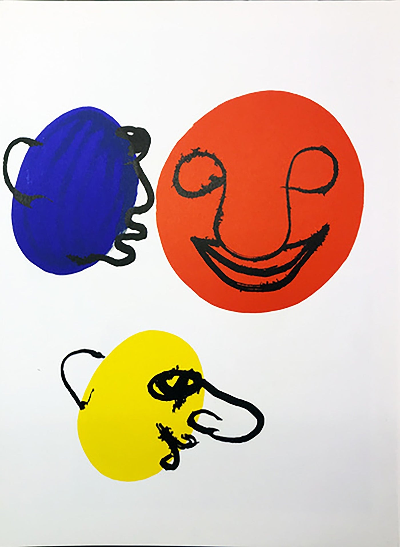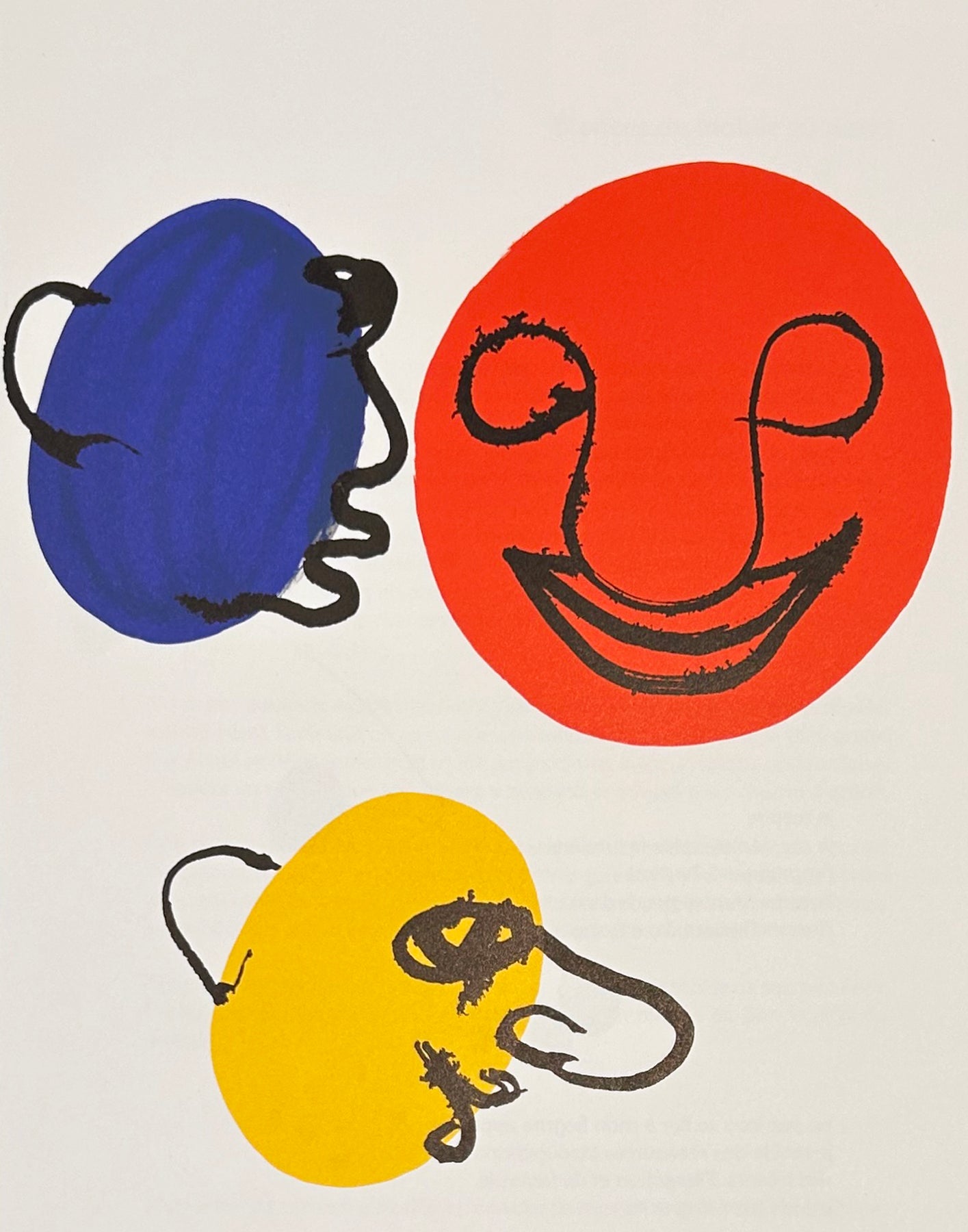 Alexander Calder was born July 22, 1898, in Lawnton, Pennsylvania. Despite coming from a family of artists -his father was a sculptor and his mother a painter- Calder did not originally intend to become an artist. After high school, he enrolled at the Stevens Institute of Technology and graduated in 1919 with a degree in engineering. He worked as a hydraulic and automotive engineer, timekeeper in a logging camp, and fireman in a ship's boiler room. While serving in the latter occupation, on a ship from New York bound for San Francisco, Calder awoke on the deck to see both a sunrise and a full moon. This image remained with Calder, and would later appear in several of his works. Calder pursued art shortly thereafter. In 1923, he moved to New York and enrolled at the Art Students' League. He also took a job illustrating for the National Police Gazette, which sent him to the Ringling Brothers and Barnum & Bailey Circus to sketch circus scenes for two weeks in 1925. The circus became a lifelong interest of Calder's, and after moving to Paris in 1926, he created the Cirque Calder, a complex and unique body of art. The assemblage included diminutive performers, animals, and props he had observed at the Ringling Brothers Circus. Fashioned from wire, leather, cloth, and other found materials, the Cirque was designed to be manipulated manually by Calder himself. The work predated the modern notion of performance art by nearly forty years. Calder developed working with wire in later works. It was from wire that he soon began to sculpt portraits of his friends and public figures of his day. His first solo gallery whow was in 1928 at the Weyhe Gallery in New York. He soon exhibited in Paris, Berlin, and elsewhere, and met such artists as Joan Miro, Fernand Leger, James Johnson Sweeney, Marcel Duchamp, and Piet Mondrian. Calder later claimed that it was meeting Mondrian and seeing his geometric painting and collages that "shocked" him toward total abstraction. He thereafter delved into abstraction, and in the fall of 1931 created a series of objects that were moved by systems of cranks and motors. Marcel Duchamp called these objects 'mobiles.' Calder later eliminated the mechanical elements of these works when he realized mobiles could move autonomously via the air's currents. It was in Paris that he also met the renowned printmaker Stanley William Hayter. While Calder is known for his sculpture, he was also talented painter, engraver, and printmaker. Throughout the 1940s and 1950s, Calder produced gouache paintings depicting the same swirling, abstract forms found in his mobiles. Numerous lithographs were produced from these paintings. In 1933, Calder left France and returned to the United States, buying a farmhouse in Roxbury, Connecticut and turning it into a studio. He also attempted large, outdoor sculptures in that decade. In 1937, Calder created his first large bolted stabile fashioned entirely from sheet metal, which was titled Devilfish. After its exhibition at the Pierre Matisse Gallery, Calder soon received commissions for works to be exhibited at the Parisian World Fair and the Museum of Modern Art in New York. In 1945, he made a series of small-scale works. Duchamp saw these works while visiting Calder's studio. Inspired by the notion of art objects that could be easily dismantled, mailed to Europe, and re-assembled for an exhibition, Duchamp planned a Calder show at Galerie Louis Carré in Paris. The renowned French author Jean-Paul Sartre wrote his now-famous essay on Calder's mobiles for the exhibition catalogue. Galerie Maeght in Paris held a Calder show in 1950, and subsequently became his exclusive dealer in France. The Guggenheim Museum in New York held a retrospective for Calder in 1964, and Fondation Maeght, in Saint-Paul-de-Vence, France, held its own retrospective in 1969. Calder died on November 11, 1976 in New York.
