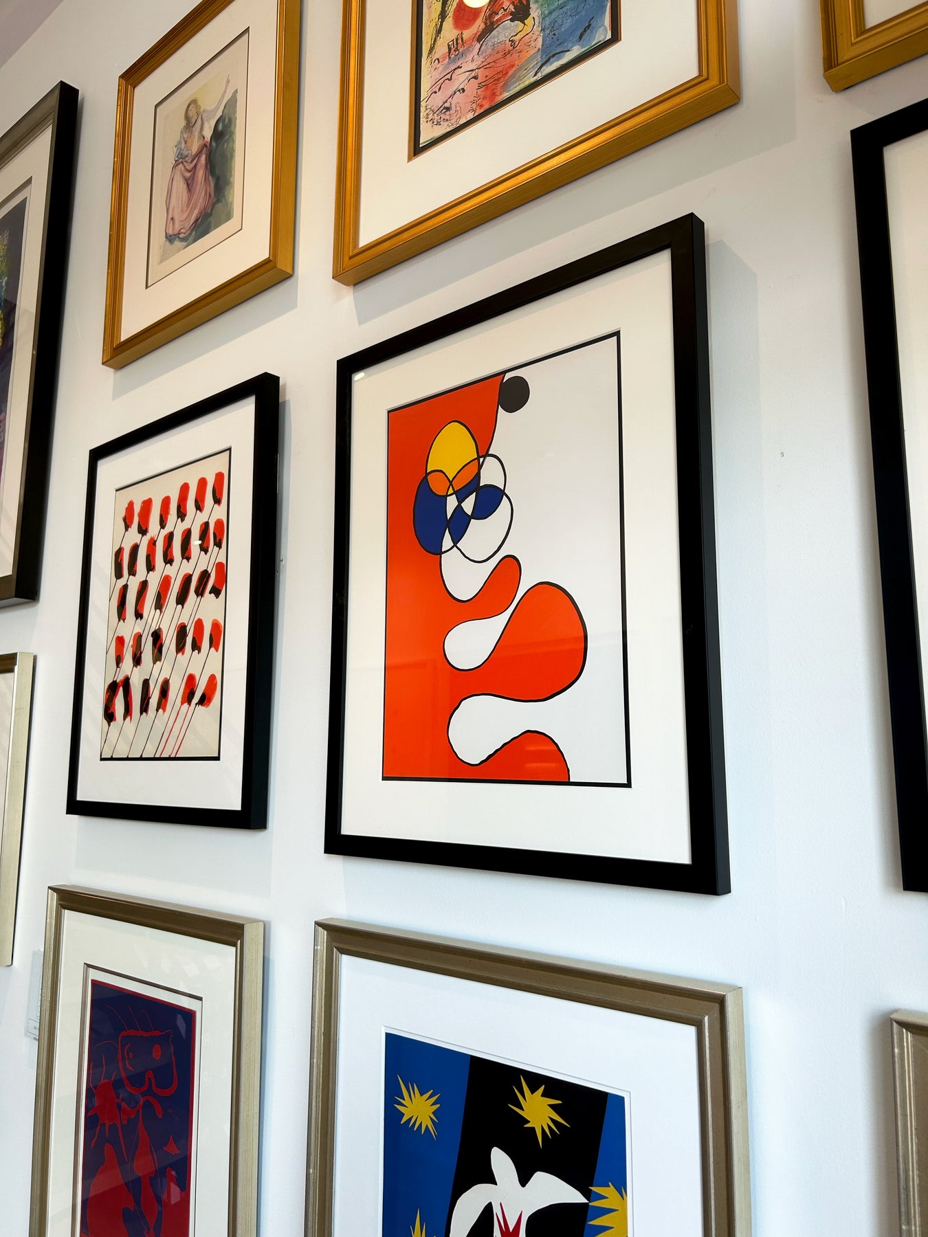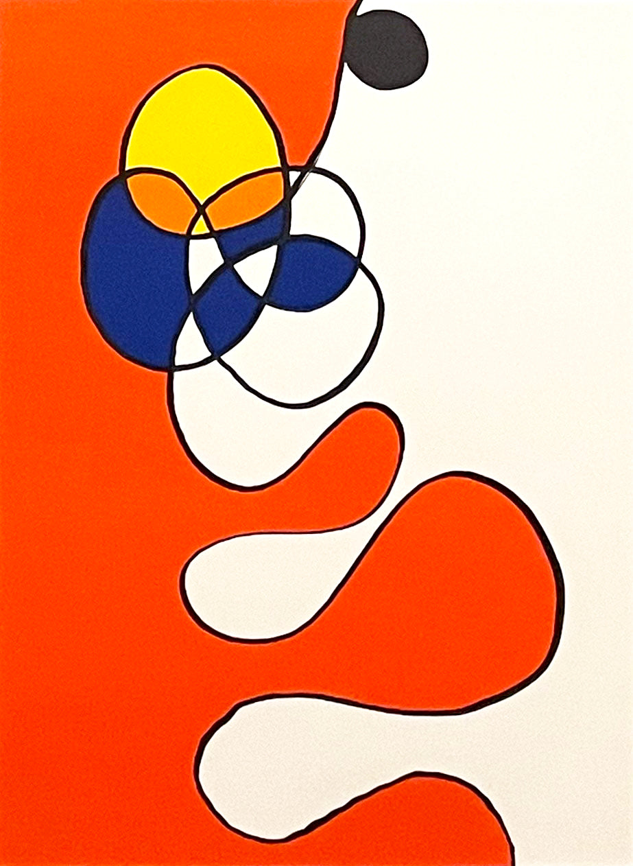Alexander Calder was born July 22, 1898, in Lawnton, Pennsylvania. Despite coming from a family of artists -his father was a sculptor and his mother a painter- Calder did not originally intend to become an artist. After high school, he enrolled at the Stevens Institute of Technology and graduated in 1919 with a degree in engineering. He worked as a hydraulic and automotive engineer, timekeeper in a logging camp, and fireman in a ship's boiler room. While serving in the latter occupation, on a ship from New York bound for San Francisco, Calder awoke on the deck to see both a sunrise and a full moon. This image remained with Calder, and would later appear in several of his works. Calder pursued art shortly thereafter. In 1923, he moved to New York and enrolled at the Art Students' League. He also took a job illustrating for the National Police Gazette, which sent him to the Ringling Brothers and Barnum & Bailey Circus to sketch circus scenes for two weeks in 1925. The circus became a lifelong interest of Calder's, and after moving to Paris in 1926, he created the Cirque Calder, a complex and unique body of art. The assemblage included diminutive performers, animals, and props he had observed at the Ringling Brothers Circus. Fashioned from wire, leather, cloth, and other found materials, the Cirque was designed to be manipulated manually by Calder himself. The work predated the modern notion of performance art by nearly forty years. Calder developed working with wire in later works. It was from wire that he soon began to sculpt portraits of his friends and public figures of his day. His first solo gallery whow was in 1928 at the Weyhe Gallery in New York. He soon exhibited in Paris, Berlin, and elsewhere, and met such artists as Joan Miro, Fernand Leger, James Johnson Sweeney, Marcel Duchamp, and Piet Mondrian. Calder later claimed that it was meeting Mondrian and seeing his geometric painting and collages that "shocked" him toward total abstraction. He thereafter delved into abstraction, and in the fall of 1931 created a series of objects that were moved by systems of cranks and motors. Marcel Duchamp called these objects 'mobiles.' Calder later eliminated the mechanical elements of these works when he realized mobiles could move autonomously via the air's currents. It was in Paris that he also met the renowned printmaker Stanley William Hayter. While Calder is known for his sculpture, he was also talented painter, engraver, and printmaker. Throughout the 1940s and 1950s, Calder produced gouache paintings depicting the same swirling, abstract forms found in his mobiles. Numerous lithographs were produced from these paintings. In 1933, Calder left France and returned to the United States, buying a farmhouse in Roxbury, Connecticut and turning it into a studio. He also attempted large, outdoor sculptures in that decade. In 1937, Calder created his first large bolted stabile fashioned entirely from sheet metal, which was titled Devilfish. After its exhibition at the Pierre Matisse Gallery, Calder soon received commissions for works to be exhibited at the Parisian World Fair and the Museum of Modern Art in New York. In 1945, he made a series of small-scale works. Duchamp saw these works while visiting Calder's studio. Inspired by the notion of art objects that could be easily dismantled, mailed to Europe, and re-assembled for an exhibition, Duchamp planned a Calder show at Galerie Louis Carre. in Paris. The renowned French author Jean-Paul Sartre wrote his now-famous essay on Calder's mobiles for the exhibition catalogue. Galerie Maeght in Paris held a Calder show in 1950, and subsequently became his exclusive dealer in France. The Guggenheim Museum in New York held a retrospective for Calder in 1964, and Fondation Maeght, in Saint-Paul-de-Vence, France, held its own retrospective in 1969. Calder died on November 11, 1976 in New York.