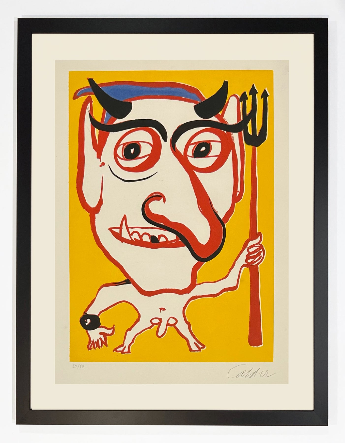 Alexander Calder was born July 22, 1898, in Lawnton, Pennsylvania. Despite coming from a family of artists -his father was a sculptor and his mother a painter- Calder did not originally intend to become an artist. After high school, he enrolled at the Stevens Institute of Technology and graduated in 1919 with a degree in engineering. He worked as a hydraulic and automotive engineer, timekeeper in a logging camp, and fireman in a ship's boiler room. While serving in the latter occupation, on a ship from New York bound for San Francisco, Calder awoke on the deck to see both a sunrise and a full moon. This image remained with Calder, and would later appear in several of his works. Calder pursued art shortly thereafter. In 1923, he moved to New York and enrolled at the Art Students' League. He also took a job illustrating for the National Police Gazette, which sent him to the Ringling Brothers and Barnum & Bailey Circus to sketch circus scenes for two weeks in 1925. The circus became a lifelong interest of Calder's, and after moving to Paris in 1926, he created the Cirque Calder, a complex and unique body of art. The assemblage included diminutive performers, animals, and props he had observed at the Ringling Brothers Circus. Fashioned from wire, leather, cloth, and other found materials, the Cirque was designed to be manipulated manually by Calder himself. The work predated the modern notion of performance art by nearly forty years. Calder developed working with wire in later works. It was from wire that he soon began to sculpt portraits of his friends and public figures of his day. His first solo gallery whow was in 1928 at the Weyhe Gallery in New York. He soon exhibited in Paris, Berlin, and elsewhere, and met such artists as Joan Miro, Fernand Leger, James Johnson Sweeney, Marcel Duchamp, and Piet Mondrian. Calder later claimed that it was meeting Mondrian and seeing his geometric painting and collages that "shocked" him toward total abstraction. He thereafter delved into abstraction, and in the fall of 1931 created a series of objects that were moved by systems of cranks and motors. Marcel Duchamp called these objects 'mobiles.' Calder later eliminated the mechanical elements of these works when he realized mobiles could move autonomously via the air's currents. It was in Paris that he also met the renowned printmaker Stanley William Hayter. While Calder is known for his sculpture, he was also talented painter, engraver, and printmaker. Throughout the 1940s and 1950s, Calder produced gouache paintings depicting the same swirling, abstract forms found in his mobiles. Numerous lithographs were produced from these paintings. In 1933, Calder left France and returned to the United States, buying a farmhouse in Roxbury, Connecticut and turning it into a studio. He also attempted large, outdoor sculptures in that decade. In 1937, Calder created his first large bolted stabile fashioned entirely from sheet metal, which was titled Devilfish. After its exhibition at the Pierre Matisse Gallery, Calder soon received commissions for works to be exhibited at the Parisian World Fair and the Museum of Modern Art in New York. In 1945, he made a series of small-scale works. Duchamp saw these works while visiting Calder's studio. Inspired by the notion of art objects that could be easily dismantled, mailed to Europe, and re-assembled for an exhibition, Duchamp planned a Calder show at Galerie Louis Carre. in Paris. The renowned French author Jean-Paul Sartre wrote his now-famous essay on Calder's mobiles for the exhibition catalogue. Galerie Maeght in Paris held a Calder show in 1950, and subsequently became his exclusive dealer in France. The Guggenheim Museum in New York held a retrospective for Calder in 1964, and Fondation Maeght, in Saint-Paul-de-Vence, France, held its own retrospective in 1969. Calder died on November 11, 1976 in New York.