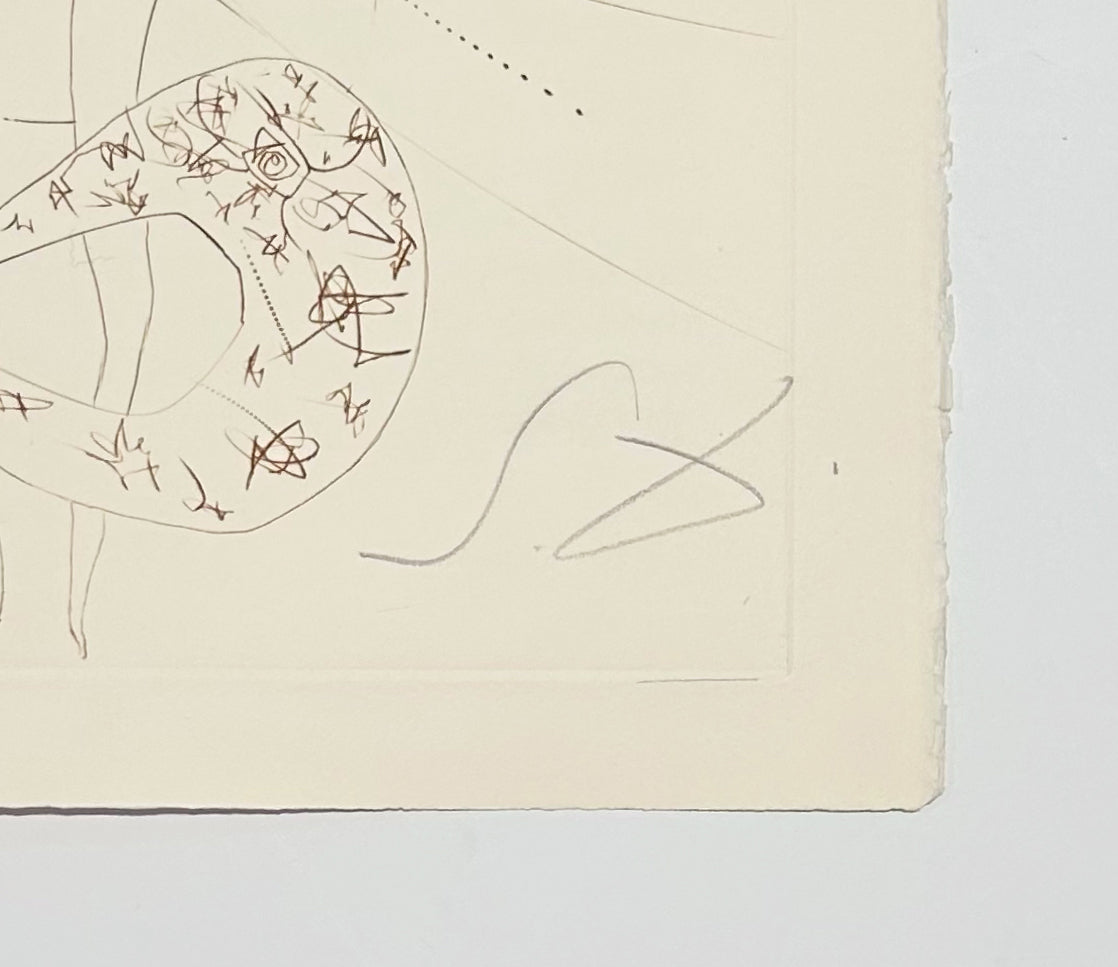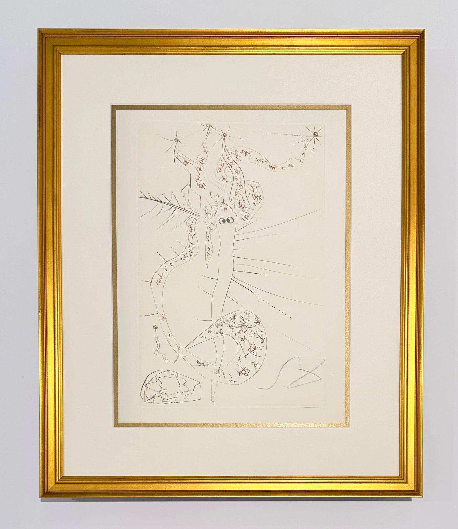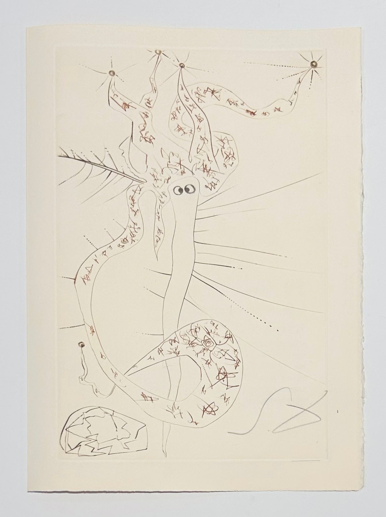 The surrealist Salvador Dali is considered to be one of the masters of 20th-Century art. His work juxtaposes a meticulous academic technique with depictions of hallucinatory characters in fantastic dreamscapes. He described his art as 'hand-painted dream photographs,' and had certain preferred and recurring images, such as the human figure with half-open drawers protruding from it, burning giraffes, and watches bent and flowing as if made from melting wax. Salvador Domenec Felip Jacint Dali Domenech was born May 11, 1904 in Figueras, Catalonia, Spain. His father, a prominent notary, encouraged his artistic inclinations and arranged for drawing lessons at age ten from the Spanish impressionist painter, Ramon Pichot. At eighteen, Dali moved to Madrid to study painting at the Academy of Arts. He developed a reputation as an eccentric, attracting attention with his manner of dress, hairstyle, and provocative comments on art. The artist experimented with forms of Cubism and Dadaism during his studies. Dali was expelled before final exams, after asserting that those judging his work were not competent enough to grade him. After leaving the Academy, Dali went to Paris where he met Spanish painters Pablo Picasso and Joan Miro. He established himself as the principal figure of a group of surrealist artists grouped around French poet Andre Breton. The surrealists hailed what Dali called the 'paranoiac-critical' method of accessing the subconscious for greater artistic creativity. Essentially, it is the ability of the artist or the viewer to perceive multiple images within the same configuration and a process through which Dali found new and unique ways to view the world around him. Years later Breton turned away from Dali, accusing him of supporting fascism, excessive self-presentation, and financial greediness. He was officially expelled from the group in 1934, in part because of his controversial political views, and was henceforth spoken about by the surrealists in past-tense, as if he were dead. Breton later coined the nickname Avida Dollars for Dali, an anagram of his name meaning 'greedy for dollars.' In addition to Surrealism, psychologist Dr. Sigmund Freud's theory of the unconscious -introduced to Dali in Freud's book The Interpretation of Dreams- also strongly influenced Dali's work and philosophy. Throughout the 1920s and early 1930s, Dali perfected the personal style that made him famous: a world of the unconscious that is recalled during one's dreams. In his work, he would juxtapose incongruous, unrelated, and often bizarre objects against desolate landscapes. This disturbing blend of precise realism and dreamlike fantasy became his hallmark. In 1929, Dali met his wife-to-be Gala. Gala (born Elena Ivanovna Diakonova), a Russian immigrant eleven years his senior, was then married to the surrealist poet Paul Éluard. Dali and Gala were married in a civil service in 1934, and again in a church after Eluard's death. Gala was Dali's muse, inspiration, lover, and model, as well as his business manager. Dali had his first one-man show in New York in 1933. With a $500 loan from Pablo Picasso, Dali was able to visit the United States for the first time a year later. In the late 1930s, he made several trips to Italy to study the art of the sixteenth and seventeenth centuries, eventually becaming an admirer of Raphael. In 1940, Dali and Gala claimed permanent residency in the United States in order to evade World War II. During his eight years in the U.S., Dali found great success, having a series of spectacular exhibitions, including a retrospective show at the Museum of Modern Art in New York. He also understood how the media worked and used it to its full potential. His attention seeking comments and flamboyant appearance -a long cape, walking stick, haughty expression, and upturned waxed mustache- helped raise him to celebrity status. He once famously said: "Every morning upon awakening, I experience a supreme pleasure: that of being Salvador Dali." His persona brought him numerous patrons. He executed portraits commissioned by celebrities such as Helena Rubinstein or Jack Warner, designed jewelry for Coco Chanel, and even storyboarded the Walt Disney short film Destiny and designed a dream sequence for Alfred Hitchcock's Spellbound. Dali had been producing limited edition prints as early as the 1930s, however the images he created in the 1960s with publishers Sidney and Phyllis Lucas are considered by collectors the apex of Dali's lithographs. His publishers encouraged the incorporation of classical themes with Surrealism, and together they assembled fascinating graphic works. Gala died in 1982, and Dali's health deteriorated thereafter. He suffered from palsy, and had injuries from a suspicious fire in his house in Pubol in 1984. The end of his life was spent in seclusion, first in Pubol and later in his apartments at Torre Galatea. Dali died on January 23, 1989 in his birth town, Figueras.