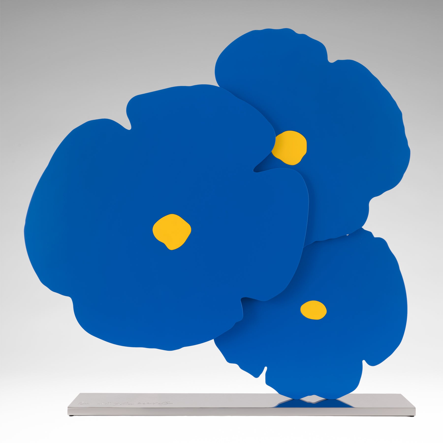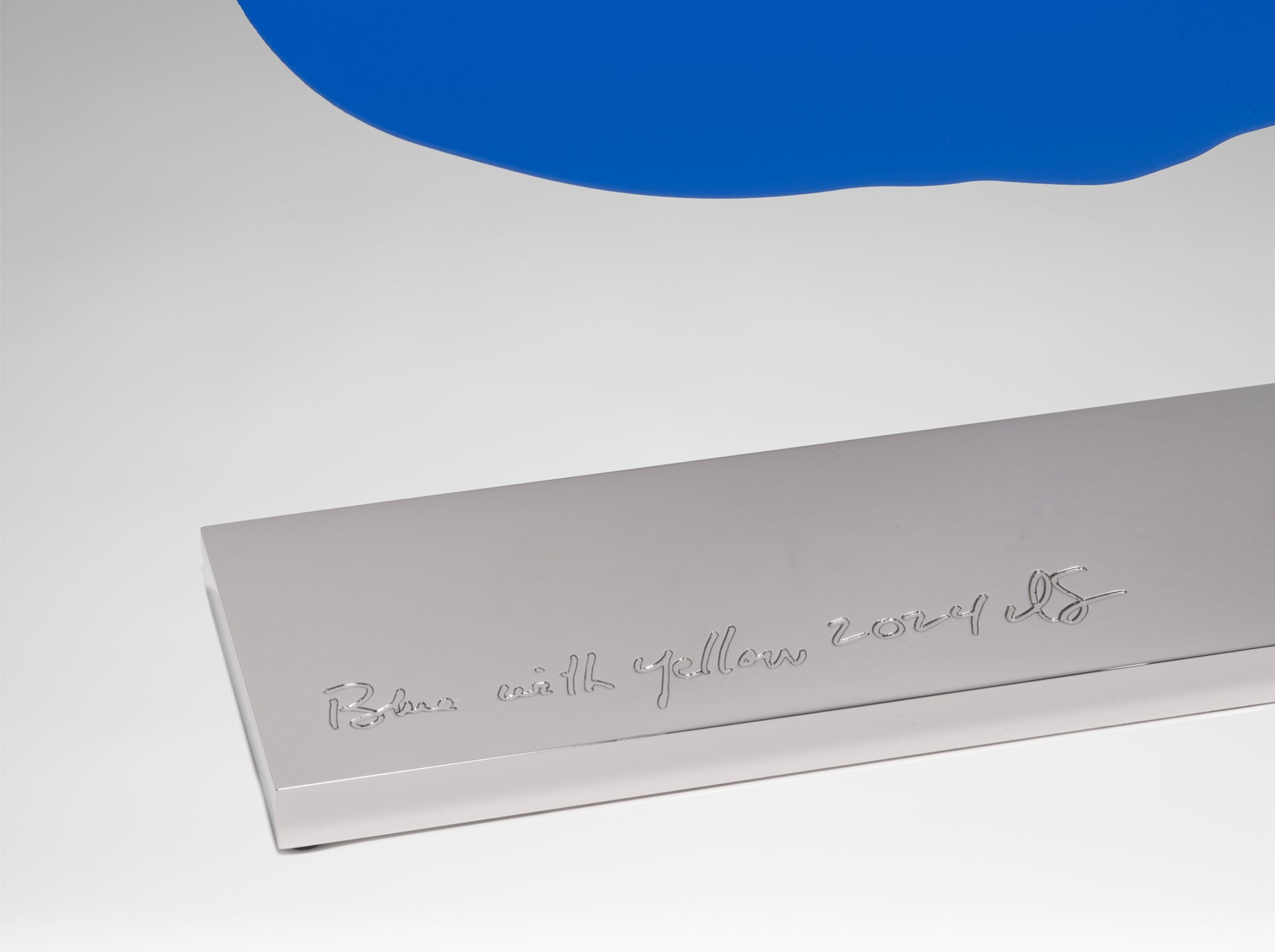 Medium: Shaped aluminum sculpture with painted stainless steel centers on polished aluminum base