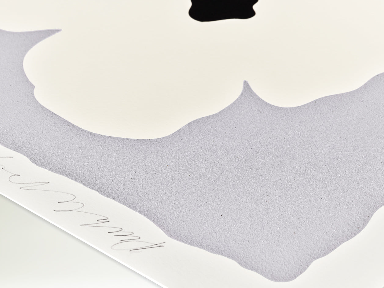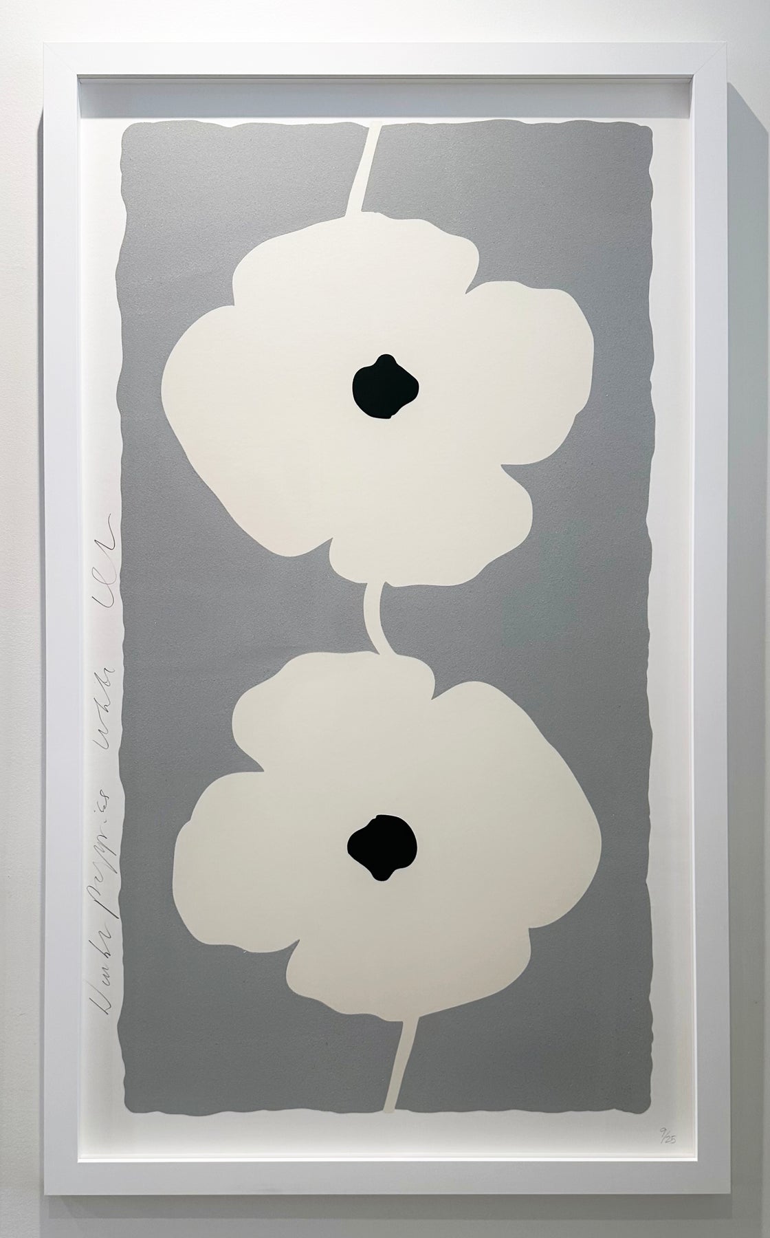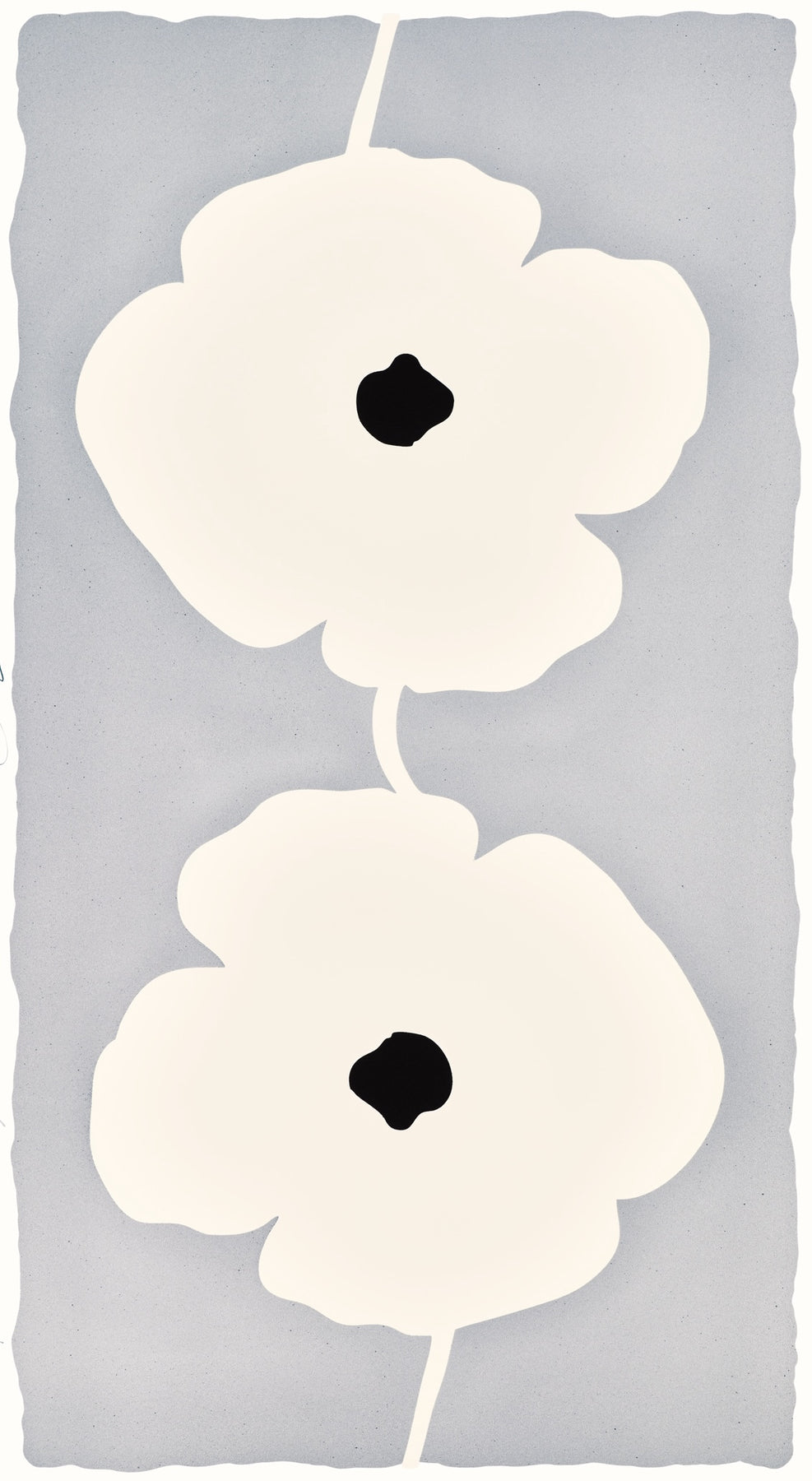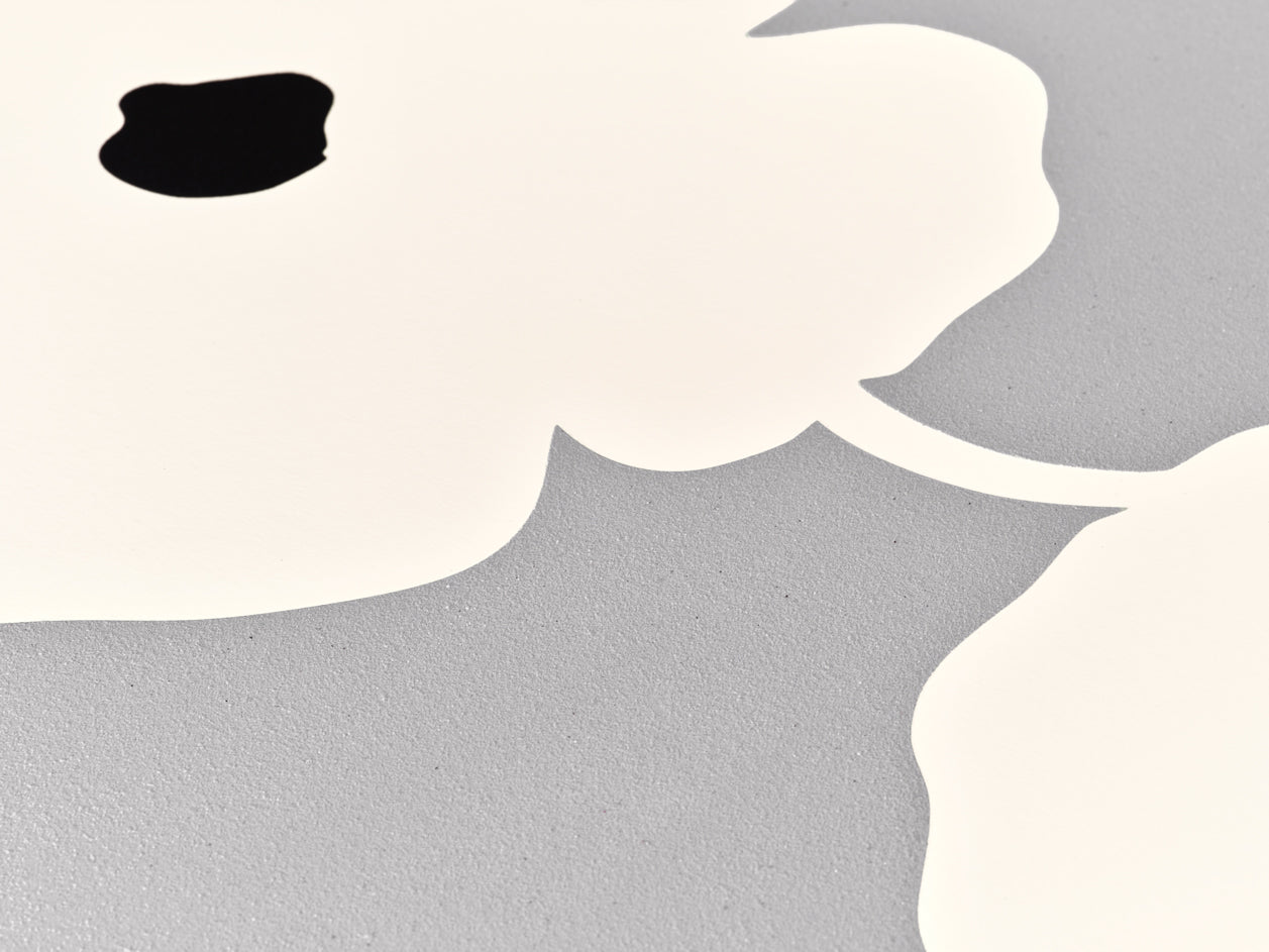 Donald Sultan, White Double Poppies, 2025 Double Poppies Portfolio, 2025, Signed, Silkscreen with enamel inks, flocking, and sand on Rising 4-ply museum board, Edition 9/25, 55 1/4" x 32 5/8" Framed Size, 52 1/2" x 30" Sheet Size, 48 1/2" x 26" Image Size