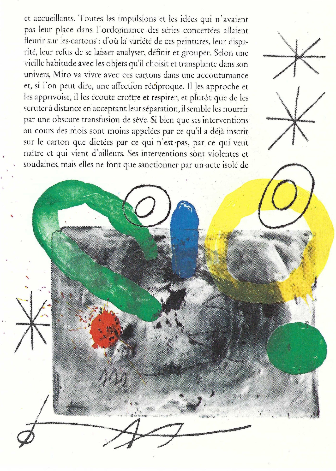 Joan Miro was born April 20, 1893 in Barcelona, Spain. Like Pablo Picasso, Henri Matisse, and Salvador Dali, Miro is one of the great pioneers of twentieth-century art. Miro began drawing at a young age, and his choice of subjects -tufts of grass, insects, birds- revealed an early affinity for the organic. Though based on his observations of nature, his works were abstractions, and bridged the gap between realistic and abstract imagery. The Surrealist concept of automatism (allowing the subconscious to dictate visual forms) helped to drive Miro's imagination throughout his career. As a result he produced vivid biomorphic imagery. Miro also identified strongly with the Surrealist poets, and collaborated with them on many artists books, to which he would contribute illustrations. In the 1960s, Miro devoted more time to printmaking, creating lithographs, etchings and aquatints. Miro was attracted to printmaking and sculpture as a respite from the solitary nature of painting, and as an opportunity to work together printers and other artisans. These experiences enhanced Miro's own creative repertoire. For instance, one notices the caligraphic nature of Miro's Femme dans la nuit ('Woman in the Night'), a wax crayona dn watercolor composition from 1967-1971, which could easily have been conceived as a study for a lithograph, despite its size and being of mixed-media. Miro recognized an advantage in printmaking, stating: "A painting is a unique example for a single collector. But if I pull seventy-five examples, I increase by seventy-five times the number of people who can own a work of mine. I increase the reach of my message seventy-five times." Miro died on December 25,1983, in Palma de Mallorca, Spain.