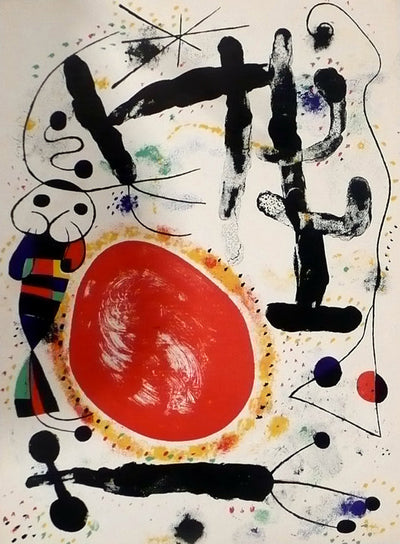 Joan Miro was born April 20, 1893 in Barcelona, Spain. Like Pablo Picasso, Henri Matisse, and Salvador Dali, Miro is one of the great pioneers of twentieth-century art. Miro began drawing at a young age, and his choice of subjects -tufts of grass, insects, birds- revealed an early affinity for the organic. Though based on his observations of nature, his works were abstractions, and bridged the gap between realistic and abstract imagery. The Surrealist concept of automatism (allowing the subconscious to dictate visual forms) helped to drive Miro's imagination throughout his career. As a result he produced vivid biomorphic imagery. Miro also identified strongly with the Surrealist poets, and collaborated with them on many artists books, to which he would contribute illustrations. In the 1960s, Miro devoted more time to printmaking, creating lithographs, etchings and aquatints. Miro was attracted to printmaking and sculpture as a respite from the solitary nature of painting, and as an opportunity to work together printers and other artisans. These experiences enhanced Miro's own creative repertoire. For instance, one notices the caligraphic nature of Miro's Femme dans la nuit ('Woman in the Night'), a wax crayona dn watercolor composition from 1967-1971, which could easily have been conceived as a study for a lithograph, despite its size and being of mixed-media. Miro recognized an advantage in printmaking, stating: "A painting is a unique example for a single collector. But if I pull seventy-five examples, I increase by seventy-five times the number of people who can own a work of mine. I increase the reach of my message seventy-five times." Miro died on December 25,1983, in Palma de Mallorca, Spain.
