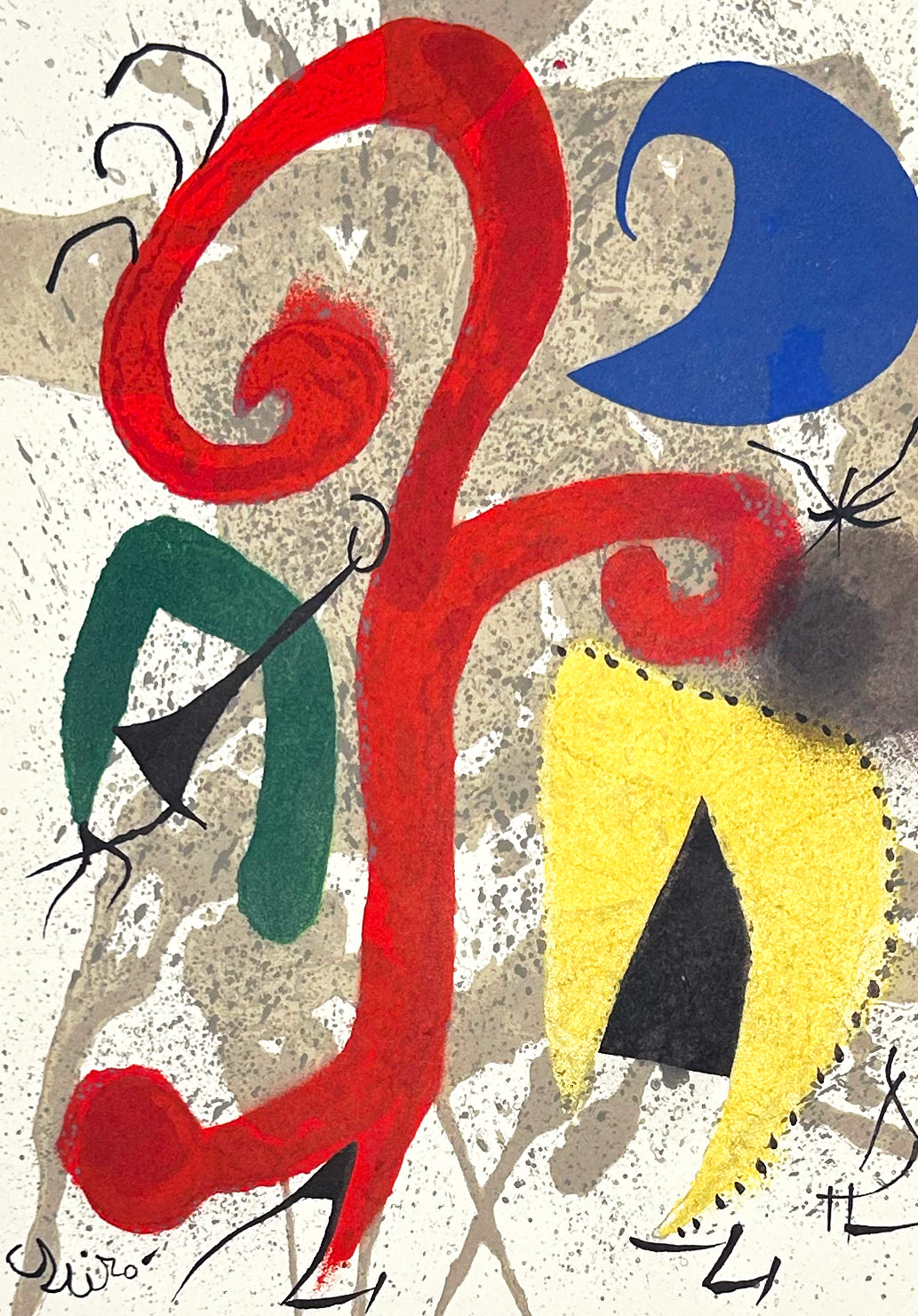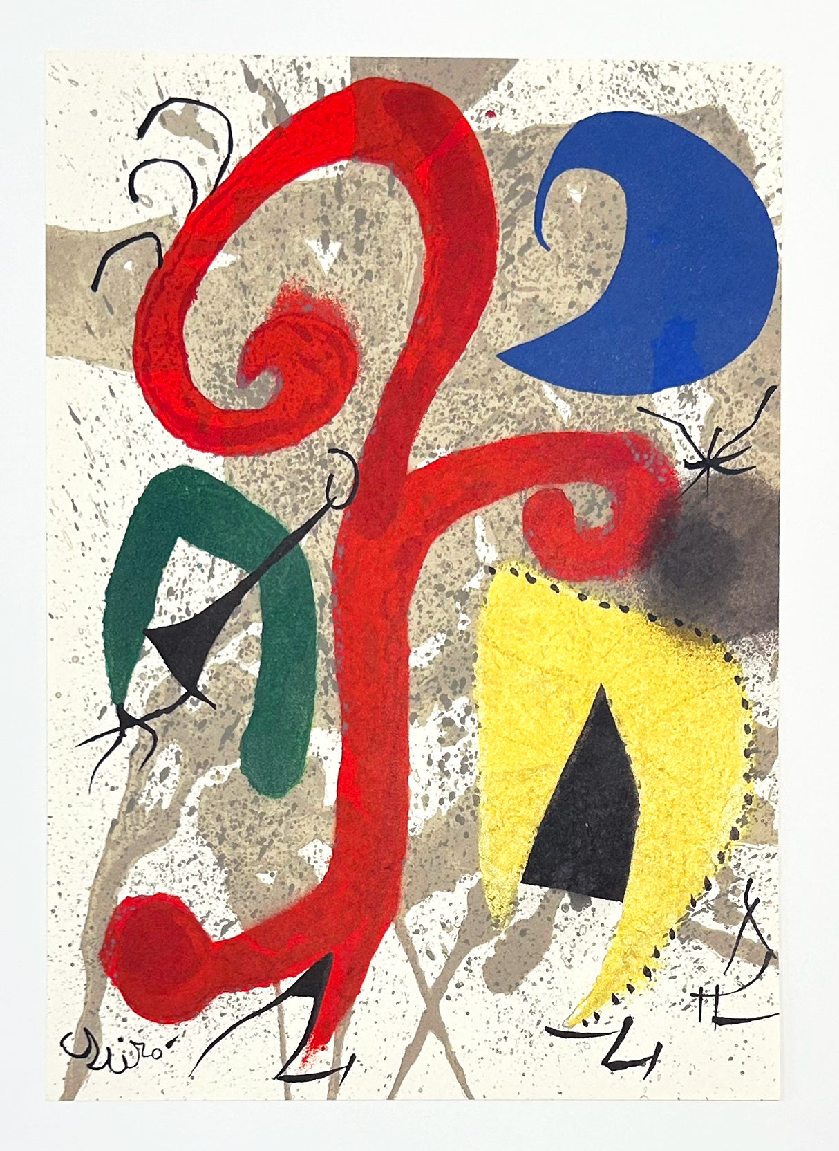 Joan Miro was born April 20, 1893 in Barcelona, Spain. Like Pablo Picasso, Henri Matisse, and Salvador Dali, Miro is one of the great pioneers of twentieth-century art. Miro began drawing at a young age, and his choice of subjects -tufts of grass, insects, birds- revealed an early affinity for the organic. Though based on his observations of nature, his works were abstractions, and bridged the gap between realistic and abstract imagery. The Surrealist concept of automatism (allowing the subconscious to dictate visual forms) helped to drive Miro's imagination throughout his career. As a result he produced vivid biomorphic imagery. Miro also identified strongly with the Surrealist poets, and collaborated with them on many artists books, to which he would contribute illustrations. In the 1960s, Miro devoted more time to printmaking, creating lithographs, etchings and aquatints. Miro was attracted to printmaking and sculpture as a respite from the solitary nature of painting, and as an opportunity to work together printers and other artisans. These experiences enhanced Miro's own creative repertoire. For instance, one notices the caligraphic nature of Miro's Femme dans la nuit ('Woman in the Night'), a wax crayona dn watercolor composition from 1967-1971, which could easily have been conceived as a study for a lithograph, despite its size and being of mixed-media. Miro recognized an advantage in printmaking, stating: "A painting is a unique example for a single collector. But if I pull seventy-five examples, I increase by seventy-five times the number of people who can own a work of mine. I increase the reach of my message seventy-five times." Miro died on December 25,1983, in Palma de Mallorca, Spain.