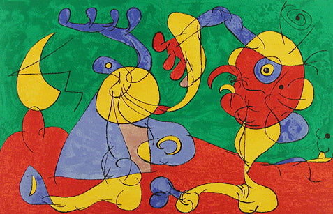 Joan Miro was born April 20, 1893 in Barcelona, Spain. Like Pablo Picasso, Henri Matisse, and Salvador Dali, Miro is one of the great pioneers of twentieth-century art. Miro began drawing at a young age, and his choice of subjects -tufts of grass, insects, birds- revealed an early affinity for the organic. Though based on his observations of nature, his works were abstractions, and bridged the gap between realistic and abstract imagery. The Surrealist concept of automatism (allowing the subconscious to dictate visual forms) helped to drive Miro's imagination throughout his career. As a result he produced vivid biomorphic imagery. Miro also identified strongly with the Surrealist poets, and collaborated with them on many artists books, to which he would contribute illustrations. In the 1960s, Miro devoted more time to printmaking, creating lithographs, etchings and aquatints. Miro was attracted to printmaking and sculpture as a respite from the solitary nature of painting, and as an opportunity to work together printers and other artisans. These experiences enhanced Miro's own creative repertoire. For instance, one notices the caligraphic nature of Miro's Femme dans la nuit ('Woman in the Night'), a wax crayona dn watercolor composition from 1967-1971, which could easily have been conceived as a study for a lithograph, despite its size and being of mixed-media. Miro recognized an advantage in printmaking, stating: "A painting is a unique example for a single collector. But if I pull seventy-five examples, I increase by seventy-five times the number of people who can own a work of mine. I increase the reach of my message seventy-five times." Miro died on December 25,1983, in Palma de Mallorca, Spain.