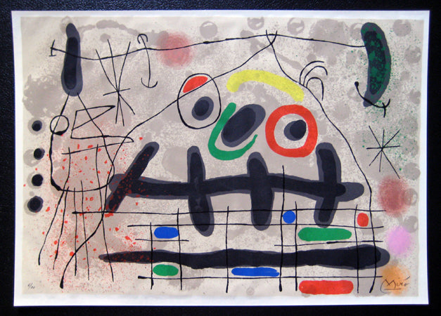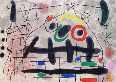Joan Miro was born April 20, 1893 in Barcelona, Spain. Like Pablo Picasso, Henri Matisse, and Salvador Dali, Miro is one of the great pioneers of twentieth-century art. Miro began drawing at a young age, and his choice of subjects -tufts of grass, insects, birds- revealed an early affinity for the organic. Though based on his observations of nature, his works were abstractions, and bridged the gap between realistic and abstract imagery. The Surrealist concept of automatism (allowing the subconscious to dictate visual forms) helped to drive Miro's imagination throughout his career. As a result he produced vivid biomorphic imagery. Miro also identified strongly with the Surrealist poets, and collaborated with them on many artists books, to which he would contribute illustrations. In the 1960s, Miro devoted more time to printmaking, creating lithographs, etchings and aquatints. Miro was attracted to printmaking and sculpture as a respite from the solitary nature of painting, and as an opportunity to work together printers and other artisans. These experiences enhanced Miro's own creative repertoire. For instance, one notices the caligraphic nature of Miro's Femme dans la nuit ('Woman in the Night'), a wax crayona dn watercolor composition from 1967-1971, which could easily have been conceived as a study for a lithograph, despite its size and being of mixed-media. Miro recognized an advantage in printmaking, stating: "A painting is a unique example for a single collector. But if I pull seventy-five examples, I increase by seventy-five times the number of people who can own a work of mine. I increase the reach of my message seventy-five times." Miro died on December 25,1983, in Palma de Mallorca, Spain.