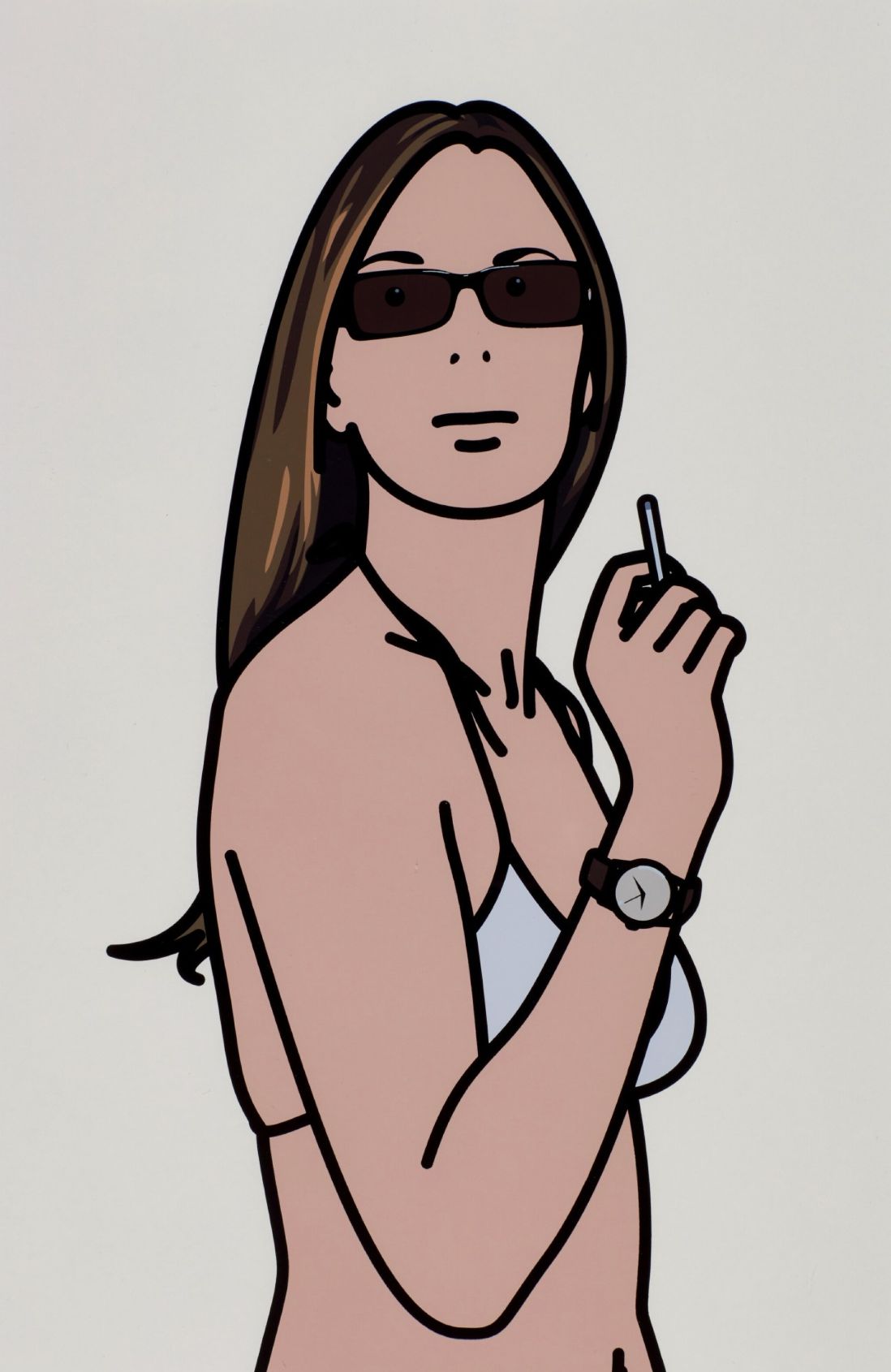 Julian Opie is a visual artist of the New British Sculpture movement. Opie emerged as an influential figure in the British art scene of the 1980s producing a series of painted metal sculptures that humorously combined loosely painted imagery with steel shapes. Portraits and animated walking figures, rendered with minimal detail in black line drawing, are hallmarks of the artist's style. His themes have been described as "engagement with art history, use of new technology, obsession with the human body" and "work with one idea across different media". When asked to describe his approach, Opie said "I often feel that trying to make something realistic is the one criterion I can feel fairly sure of. Another one I sometimes use is, would I like to have it in my room? And I occasionally use the idea, if God allowed you to show Him one [portrait] to judge you by, would this really be it?"