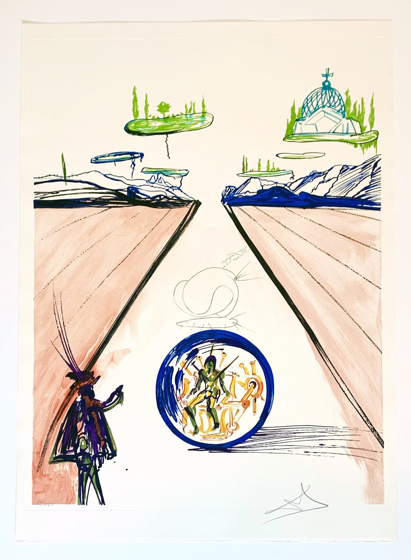 The surrealist Salvador Dali is considered to be one of the masters of 20th-Century art. His work juxtaposes a meticulous academic technique with depictions of hallucinatory characters in fantastic dreamscapes. He described his art as 'hand-painted dream photographs,' and had certain preferred and recurring images, such as the human figure with half-open drawers protruding from it, burning giraffes, and watches bent and flowing as if made from melting wax. Salvador Domenec Felip Jacint Dali Domenech was born May 11, 1904 in Figueras, Catalonia, Spain. His father, a prominent notary, encouraged his artistic inclinations and arranged for drawing lessons at age ten from the Spanish impressionist painter, Ramon Pichot. At eighteen, Dali moved to Madrid to study painting at the Academy of Arts. He developed a reputation as an eccentric, attracting attention with his manner of dress, hairstyle, and provocative comments on art. The artist experimented with forms of Cubism and Dadaism during his studies. Dali was expelled before final exams, after asserting that those judging his work were not competent enough to grade him. After leaving the Academy, Dali went to Paris where he met Spanish painters Pablo Picasso and Joan Miro. He established himself as the principal figure of a group of surrealist artists grouped around French poet Andre Breton. The surrealists hailed what Dali called the 'paranoiac-critical' method of accessing the subconscious for greater artistic creativity. Essentially, it is the ability of the artist or the viewer to perceive multiple images within the same configuration and a process through which Dali found new and unique ways to view the world around him. Years later Breton turned away from Dali, accusing him of supporting fascism, excessive self-presentation, and financial greediness. He was officially expelled from the group in 1934, in part because of his controversial political views, and was henceforth spoken about by the surrealists in past-tense, as if he were dead. Breton later coined the nickname Avida Dollars for Dali, an anagram of his name meaning 'greedy for dollars.' In addition to Surrealism, psychologist Dr. Sigmund Freud's theory of the unconscious -introduced to Dali in Freud's book The Interpretation of Dreams- also strongly influenced Dali's work and philosophy. Throughout the 1920s and early 1930s, Dali perfected the personal style that made him famous: a world of the unconscious that is recalled during one's dreams. In his work, he would juxtapose incongruous, unrelated, and often bizarre objects against desolate landscapes. This disturbing blend of precise realism and dreamlike fantasy became his hallmark. In 1929, Dali met his wife-to-be Gala. Gala (born Elena Ivanovna Diakonova), a Russian immigrant eleven years his senior, was then married to the surrealist poet Paul Éluard. Dali and Gala were married in a civil service in 1934, and again in a church after Eluard's death. Gala was Dali's muse, inspiration, lover, and model, as well as his business manager. Dali had his first one-man show in New York in 1933. With a $500 loan from Pablo Picasso, Dali was able to visit the United States for the first time a year later. In the late 1930s, he made several trips to Italy to study the art of the sixteenth and seventeenth centuries, eventually becaming an admirer of Raphael. In 1940, Dali and Gala claimed permanent residency in the United States in order to evade World War II. During his eight years in the U.S., Dali found great success, having a series of spectacular exhibitions, including a retrospective show at the Museum of Modern Art in New York. He also understood how the media worked and used it to its full potential. His attention seeking comments and flamboyant appearance -a long cape, walking stick, haughty expression, and upturned waxed mustache- helped raise him to celebrity status. He once famously said: "Every morning upon awakening, I experience a supreme pleasure: that of being Salvador Dali." His persona brought him numerous patrons. He executed portraits commissioned by celebrities such as Helena Rubinstein or Jack Warner, designed jewelry for Coco Chanel, and even storyboarded the Walt Disney short film Destiny and designed a dream sequence for Alfred Hitchcock's Spellbound. Dali had been producing limited edition prints as early as the 1930s, however the images he created in the 1960s with publishers Sidney and Phyllis Lucas are considered by collectors the apex of Dali's lithographs. His publishers encouraged the incorporation of classical themes with Surrealism, and together they assembled fascinating graphic works. Gala died in 1982, and Dali's health deteriorated thereafter. He suffered from palsy, and had injuries from a suspicious fire in his house in Pubol in 1984. The end of his life was spent in seclusion, first in Pubol and later in his apartments at Torre Galatea. Dali died on January 23, 1989 in his birth town, Figueras.