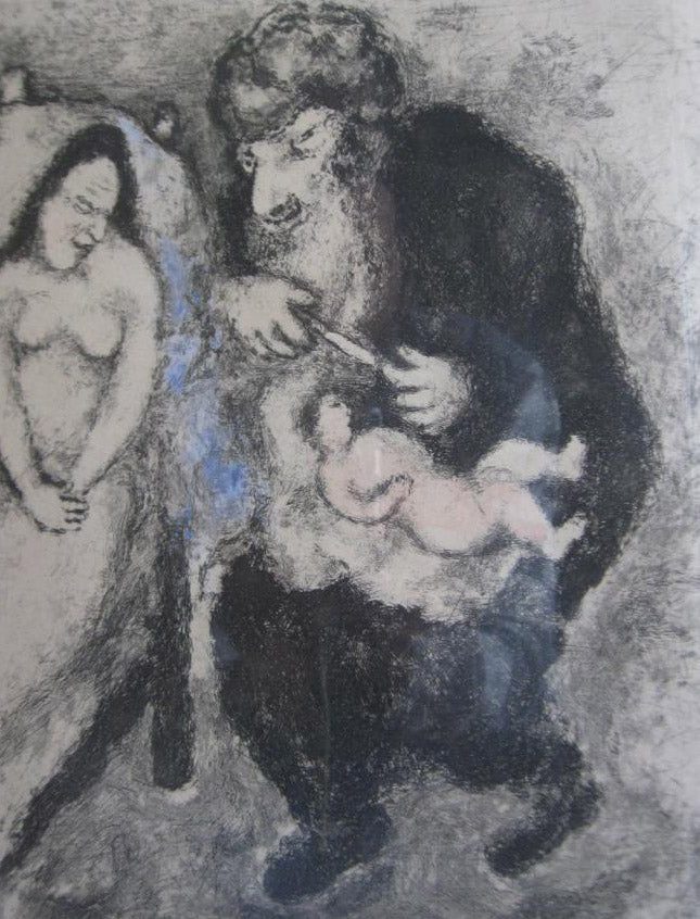 Marc Chagall was born in Vitebsk, Byelorussia, in 1887 to a poor Hasidic family. The eldest of nine children, Marc Chagall studied first in a heder before moving to a secular Russian school, where he began to display his artistic talent. With his mother's support, and despite his father's disapproval, Chagall pursued his interest in art, going to St. Petersburg in 1907 to study art with Leon Bakst. Influenced by contemporary Russian painting, Chagall's distinctive, child-like style, often centering on images from his childhood, began to emerge. From 1910 to 1914, Marc Chagall lived in Paris, and there absorbed the works of the leading cubist, surrealist, and fauvist painters. It was during this period that Chagall painted some of his most famous paintings of the Jewish shtetl or village, and developed the features that became recognizable trademarks of his art. Strong and often bright colors portray the world with a dreamlike, non-realistic simplicity, and the fusion of fantasy, religion, and nostalgia infuses his work with a joyous quality. Animals, workmen, lovers, and musicians populate his figures; the "fiddler on the roof" recurs frequently, often hovering within another scene. Chagall's work of this period displays the influence of contemporary French painting, but his style remains independent of any one school of art. He exhibited regularly in the Salon des Independants. In 1914, before the outbreak of World War I, Marc Chagall held a one-man show in Berlin, exhibiting work dominated by Jewish images and personages. During the war, he resided in Russia, and in 1917, endorsing the revolution, he was appointed Commissar for Fine Arts in Vitebsk and then director of the newly established Free Academy of Art. The Bolshevik authorities, however, frowned upon Chagall's style of art as too modern, and in 1922, Marc Chagall left Russia, settling in France one year later. He lived there permanently except for the years 1941 - 1948 when, fleeing France during World War II, he resided in the United States. Chagall's horror over the Nazi rise to power is expressed in works depicting Jewish martyrs and Jewish refugees. In addition to images of the Hassidic world, Chagall's paintings are inspired by themes from the Bible. His fascination with the Bible culminated in a series of over 100 etchings illustrating the Bible, many of which incorporate elements from Jewish folklore and from religious life in Vitebsk. Chagall's other illustrations include works by Gogol, La Fontaine, Y. L. Peretz, and his autobiographical Ma Vie (1931; My Life 1960) and Chagall by Chagall (1979) Marc Chagall painted with a variety of media, such as oils, water colors, and gouaches. His work also expanded to other forms of art, including ceramics, mosaics, and stained glass. Among his most famous building decorations are the ceiling of the Opera House in Paris, murals at the New York Metropolitan Opera, a glass window at the United Nations, and decorations at the Vatican Israel, which Marc Chagall first visited in 1931 for the opening of the Tel Aviv Art Museum, is likewise endowed with some of Chagall's work, most notably the twelve stained glass windows at Hadassah Hospital and wall decorations at the Knesset. Marc Chagall received many prizes and much recognition for his work. He was also one of very few artists to exhibit work at the Louvre in their lifetime. Marc Chagall's involvement with printmaking dates to 1922 and his return to Berlin after World War I. In the course of trying to recover the paintings he had left behind with Sturm Gallery's director Herwarth Walden in 1914, Walter Feilchenfeldt, the director of the Cassirer Gallery, offered to publish Chagall's then recently completed autobiography Mein Leben (My Life) to be illustrated with etchings. Although the book was never published due to translation problems, a suite of 20 etchings was created by the artist in the medium of dry-point etching depicting scenes and figures in Chagall's newly evolved naïve-realistic style. Chagall had never before been introduced to printmaking techniques and became very enamored with them, trying his hand with woodcuts and lithography, too. He felt that in these mediums his narrative flair had found its proper expression. Chagall wrote in 1960, "Since I started using a pencil, I have sought for this certain something that could spread like a stream toward unknown and alluring shores." And again, "When I held a lithographic stone or a copperplate in my hand I thought I was touching a talisman. It seemed to me that I could put all my joys and sorrows in it....Everything that touched my life through the years, births, deaths, weddings, flowers, animals, birds, the poor workers, my parents, lovers in the night, the biblical prophets, on the street, at home, in the temple and in heaven. And as I grew older, the tragedy of life within us and around us."1 It is in this sense that Chagall did lithographs, and they have become the stream that carries the message of his painting into the wide world. Fortuitously, it was a printmaking commission that brought Marc Chagall back to Paris in 1923. The famous dealer and editor, Ambroise Vollard, invited him to do some book illustrations and the artist requested the book be the Russian author Gogol's Dead Souls. So it was that Marc Chagall engraved 107 etchings on this theme in the course of only two years. Although in style they are related to the Mein Leben dry-points, their technique is obviously more elaborate and refined. Indicative of how the various creative mediums are related, the artist found that in the process of developing engraved imagery to illustrate Gogol he was able to revive his own Russian themes. As he had been longing to surround himself with the paintings he had lost in the course of WWI and his sojourn in Russia, he seized upon this inspiration to reconstruct many of his earlier missing canvasses. Other themes also evolved that were connected to his more recent Mo