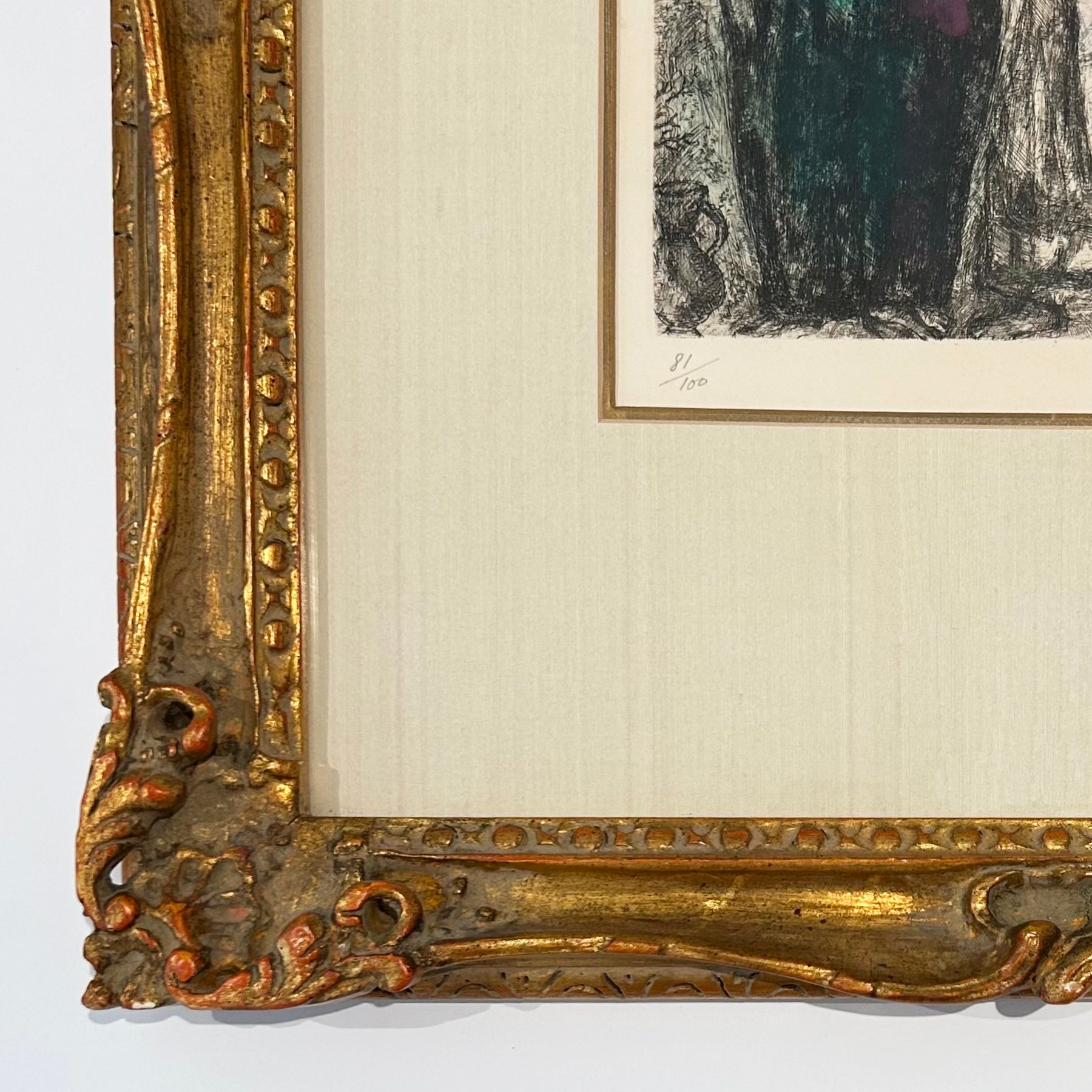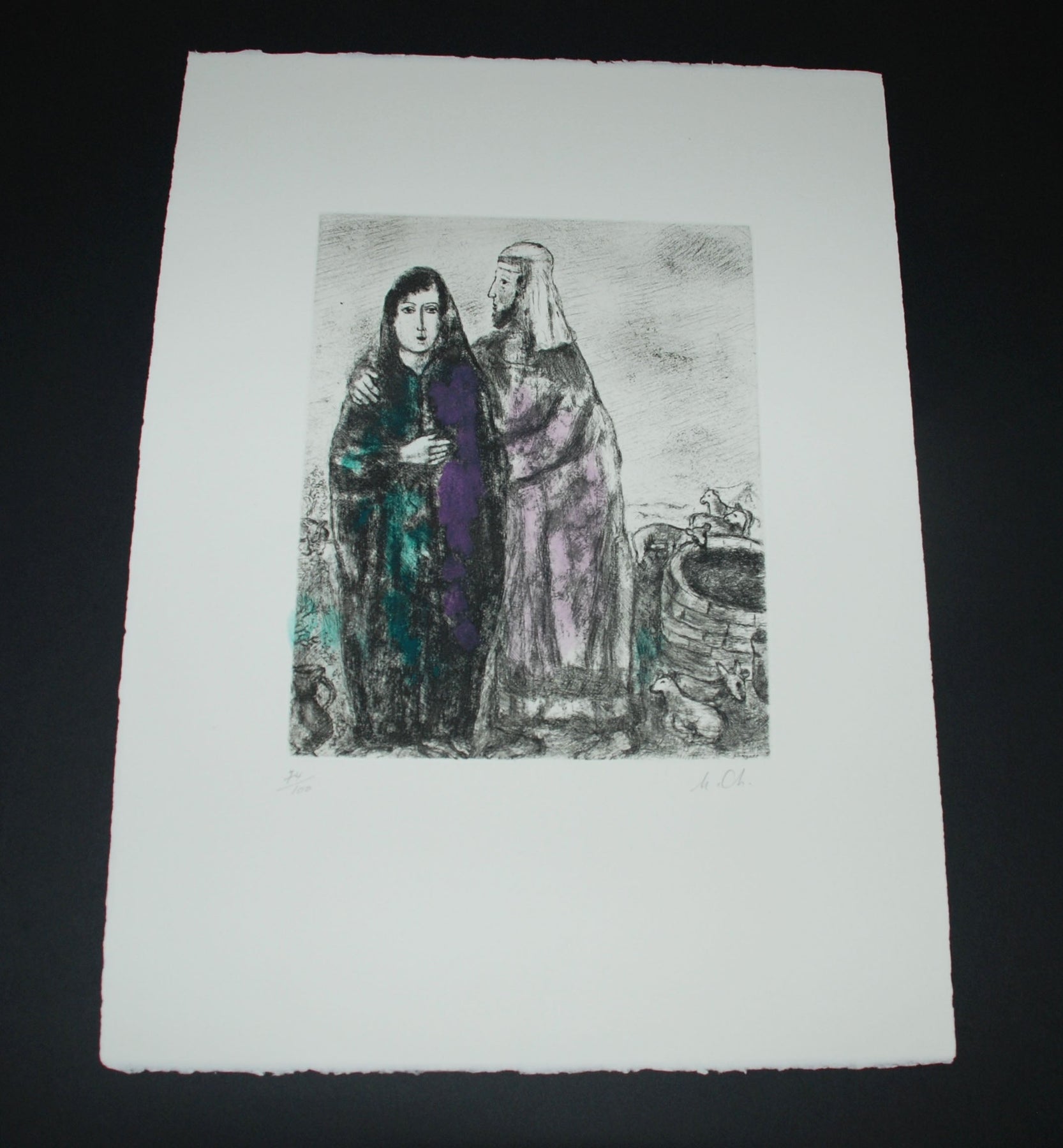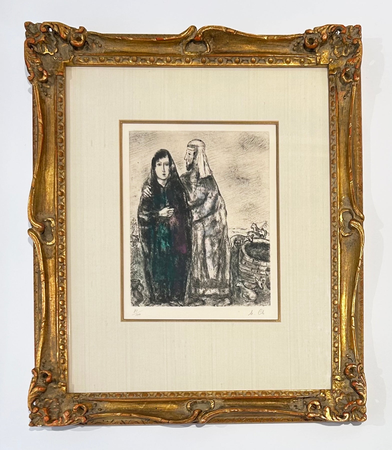 Marc Chagall was born in Vitebsk, Byelorussia, in 1887 to a poor Hasidic family. The eldest of nine children, Marc Chagall studied first in a heder before moving to a secular Russian school, where he began to display his artistic talent. With his mother's support, and despite his father's disapproval, Chagall pursued his interest in art, going to St. Petersburg in 1907 to study art with Leon Bakst. Influenced by contemporary Russian painting, Chagall's distinctive, child-like style, often centering on images from his childhood, began to emerge. From 1910 to 1914, Marc Chagall lived in Paris, and there absorbed the works of the leading cubist, surrealist, and fauvist painters. It was during this period that Chagall painted some of his most famous paintings of the Jewish shtetl or village, and developed the features that became recognizable trademarks of his art. Strong and often bright colors portray the world with a dreamlike, non-realistic simplicity, and the fusion of fantasy, religion, and nostalgia infuses his work with a joyous quality. Animals, workmen, lovers, and musicians populate his figures; the "fiddler on the roof" recurs frequently, often hovering within another scene. Chagall's work of this period displays the influence of contemporary French painting, but his style remains independent of any one school of art. He exhibited regularly in the Salon des Independants. In 1914, before the outbreak of World War I, Marc Chagall held a one-man show in Berlin, exhibiting work dominated by Jewish images and personages. During the war, he resided in Russia, and in 1917, endorsing the revolution, he was appointed Commissar for Fine Arts in Vitebsk and then director of the newly established Free Academy of Art. The Bolshevik authorities, however, frowned upon Chagall's style of art as too modern, and in 1922, Marc Chagall left Russia, settling in France one year later. He lived there permanently except for the years 1941 - 1948 when, fleeing France during World War II, he resided in the United States. Chagall's horror over the Nazi rise to power is expressed in works depicting Jewish martyrs and Jewish refugees. In addition to images of the Hassidic world, Chagall's paintings are inspired by themes from the Bible. His fascination with the Bible culminated in a series of over 100 etchings illustrating the Bible, many of which incorporate elements from Jewish folklore and from religious life in Vitebsk. Chagall's other illustrations include works by Gogol, La Fontaine, Y. L. Peretz, and his autobiographical Ma Vie (1931; My Life 1960) and Chagall by Chagall (1979) Marc Chagall painted with a variety of media, such as oils, water colors, and gouaches. His work also expanded to other forms of art, including ceramics, mosaics, and stained glass. Among his most famous building decorations are the ceiling of the Opera House in Paris, murals at the New York Metropolitan Opera, a glass window at the United Nations, and decorations at the Vatican Israel, which Marc Chagall first visited in 1931 for the opening of the Tel Aviv Art Museum, is likewise endowed with some of Chagall's work, most notably the twelve stained glass windows at Hadassah Hospital and wall decorations at the Knesset. Marc Chagall received many prizes and much recognition for his work. He was also one of very few artists to exhibit work at the Louvre in their lifetime. Marc Chagall's involvement with printmaking dates to 1922 and his return to Berlin after World War I. In the course of trying to recover the paintings he had left behind with Sturm Gallery's director Herwarth Walden in 1914, Walter Feilchenfeldt, the director of the Cassirer Gallery, offered to publish Chagall's then recently completed autobiography Mein Leben (My Life) to be illustrated with etchings. Although the book was never published due to translation problems, a suite of 20 etchings was created by the artist in the medium of dry-point etching depicting scenes and figures in Chagall's newly evolved naïve-realistic style. Chagall had never before been introduced to printmaking techniques and became very enamored with them, trying his hand with woodcuts and lithography, too. He felt that in these mediums his narrative flair had found its proper expression. Chagall wrote in 1960, "Since I started using a pencil, I have sought for this certain something that could spread like a stream toward unknown and alluring shores." And again, "When I held a lithographic stone or a copperplate in my hand I thought I was touching a talisman. It seemed to me that I could put all my joys and sorrows in it....Everything that touched my life through the years, births, deaths, weddings, flowers, animals, birds, the poor workers, my parents, lovers in the night, the biblical prophets, on the street, at home, in the temple and in heaven. And as I grew older, the tragedy of life within us and around us."1 It is in this sense that Chagall did lithographs, and they have become the stream that carries the message of his painting into the wide world. Fortuitously, it was a printmaking commission that brought Marc Chagall back to Paris in 1923. The famous dealer and editor, Ambroise Vollard, invited him to do some book illustrations and the artist requested the book be the Russian author Gogol's Dead Souls. So it was that Marc Chagall engraved 107 etchings on this theme in the course of only two years. Although in style they are related to the Mein Leben dry-points, their technique is obviously more elaborate and refined. Indicative of how the various creative mediums are related, the artist found that in the process of developing engraved imagery to illustrate Gogol he was able to revive his own Russian themes. As he had been longing to surround himself with the paintings he had lost in the course of WWI and his sojourn in Russia, he seized upon this inspiration to reconstruct many of his earlier missing canvasses. Other themes also evolved that were connected to his more recent Mo
