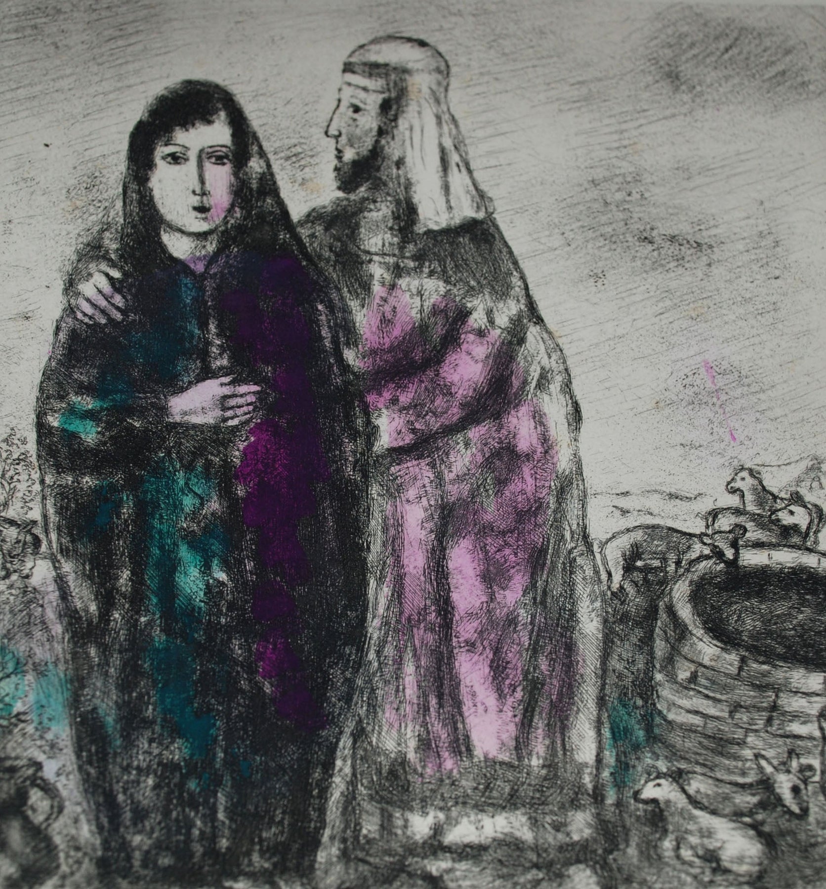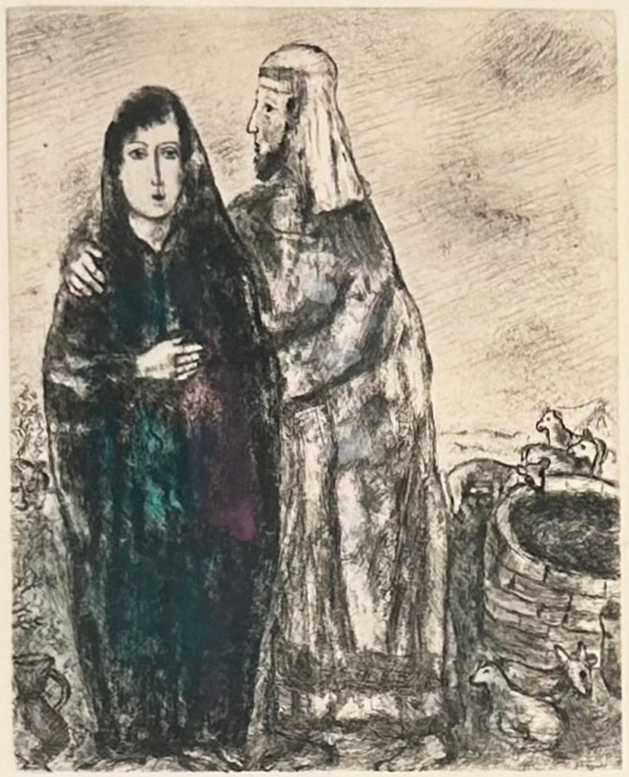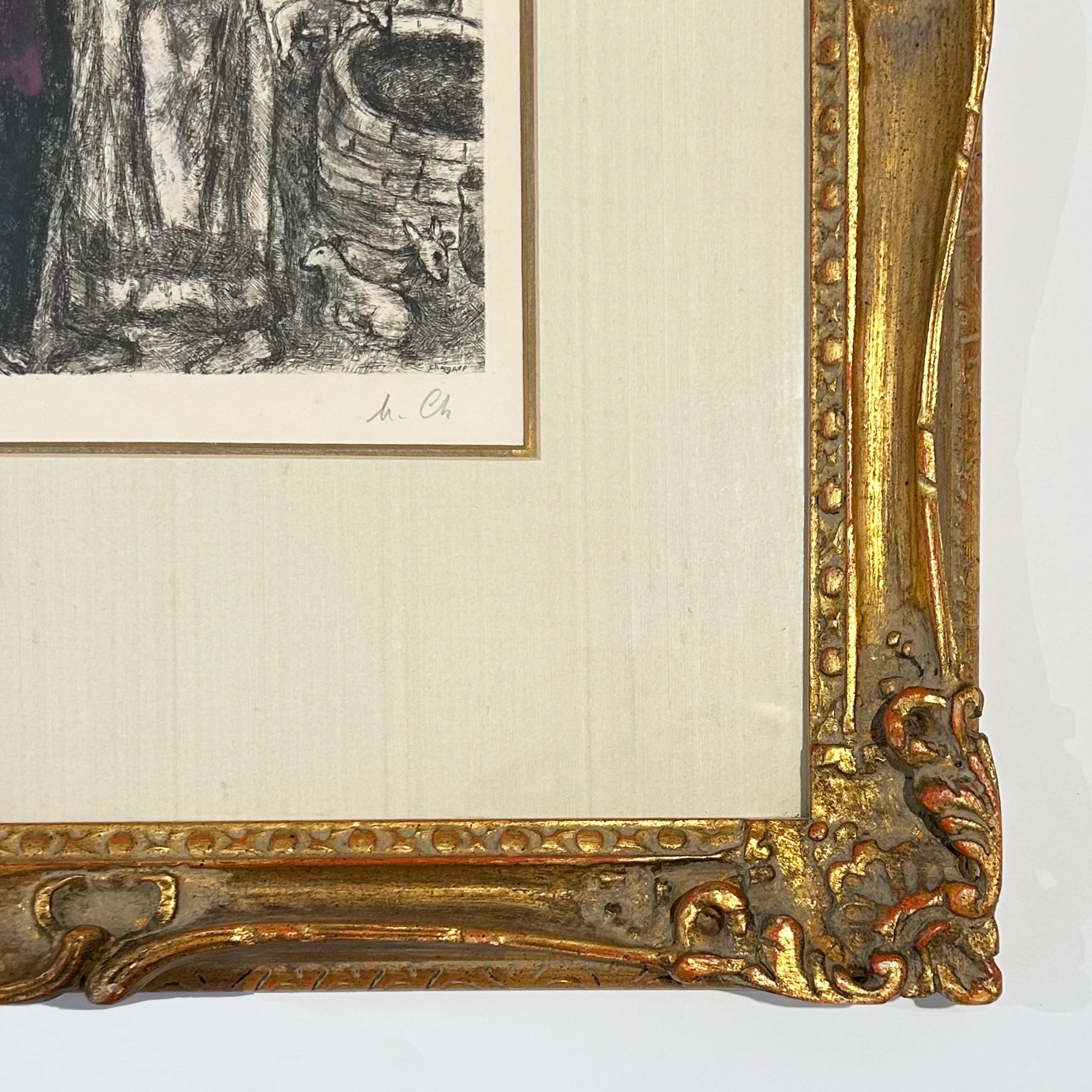 Marc Chagall was born in Vitebsk, Byelorussia, in 1887 to a poor Hasidic family. The eldest of nine children, Marc Chagall studied first in a heder before moving to a secular Russian school, where he began to display his artistic talent. With his mother's support, and despite his father's disapproval, Chagall pursued his interest in art, going to St. Petersburg in 1907 to study art with Leon Bakst. Influenced by contemporary Russian painting, Chagall's distinctive, child-like style, often centering on images from his childhood, began to emerge. From 1910 to 1914, Marc Chagall lived in Paris, and there absorbed the works of the leading cubist, surrealist, and fauvist painters. It was during this period that Chagall painted some of his most famous paintings of the Jewish shtetl or village, and developed the features that became recognizable trademarks of his art. Strong and often bright colors portray the world with a dreamlike, non-realistic simplicity, and the fusion of fantasy, religion, and nostalgia infuses his work with a joyous quality. Animals, workmen, lovers, and musicians populate his figures; the "fiddler on the roof" recurs frequently, often hovering within another scene. Chagall's work of this period displays the influence of contemporary French painting, but his style remains independent of any one school of art. He exhibited regularly in the Salon des Independants. In 1914, before the outbreak of World War I, Marc Chagall held a one-man show in Berlin, exhibiting work dominated by Jewish images and personages. During the war, he resided in Russia, and in 1917, endorsing the revolution, he was appointed Commissar for Fine Arts in Vitebsk and then director of the newly established Free Academy of Art. The Bolshevik authorities, however, frowned upon Chagall's style of art as too modern, and in 1922, Marc Chagall left Russia, settling in France one year later. He lived there permanently except for the years 1941 - 1948 when, fleeing France during World War II, he resided in the United States. Chagall's horror over the Nazi rise to power is expressed in works depicting Jewish martyrs and Jewish refugees. In addition to images of the Hassidic world, Chagall's paintings are inspired by themes from the Bible. His fascination with the Bible culminated in a series of over 100 etchings illustrating the Bible, many of which incorporate elements from Jewish folklore and from religious life in Vitebsk. Chagall's other illustrations include works by Gogol, La Fontaine, Y. L. Peretz, and his autobiographical Ma Vie (1931; My Life 1960) and Chagall by Chagall (1979) Marc Chagall painted with a variety of media, such as oils, water colors, and gouaches. His work also expanded to other forms of art, including ceramics, mosaics, and stained glass. Among his most famous building decorations are the ceiling of the Opera House in Paris, murals at the New York Metropolitan Opera, a glass window at the United Nations, and decorations at the Vatican Israel, which Marc Chagall first visited in 1931 for the opening of the Tel Aviv Art Museum, is likewise endowed with some of Chagall's work, most notably the twelve stained glass windows at Hadassah Hospital and wall decorations at the Knesset. Marc Chagall received many prizes and much recognition for his work. He was also one of very few artists to exhibit work at the Louvre in their lifetime. Marc Chagall's involvement with printmaking dates to 1922 and his return to Berlin after World War I. In the course of trying to recover the paintings he had left behind with Sturm Gallery's director Herwarth Walden in 1914, Walter Feilchenfeldt, the director of the Cassirer Gallery, offered to publish Chagall's then recently completed autobiography Mein Leben (My Life) to be illustrated with etchings. Although the book was never published due to translation problems, a suite of 20 etchings was created by the artist in the medium of dry-point etching depicting scenes and figures in Chagall's newly evolved naïve-realistic style. Chagall had never before been introduced to printmaking techniques and became very enamored with them, trying his hand with woodcuts and lithography, too. He felt that in these mediums his narrative flair had found its proper expression. Chagall wrote in 1960, "Since I started using a pencil, I have sought for this certain something that could spread like a stream toward unknown and alluring shores." And again, "When I held a lithographic stone or a copperplate in my hand I thought I was touching a talisman. It seemed to me that I could put all my joys and sorrows in it....Everything that touched my life through the years, births, deaths, weddings, flowers, animals, birds, the poor workers, my parents, lovers in the night, the biblical prophets, on the street, at home, in the temple and in heaven. And as I grew older, the tragedy of life within us and around us."1 It is in this sense that Chagall did lithographs, and they have become the stream that carries the message of his painting into the wide world. Fortuitously, it was a printmaking commission that brought Marc Chagall back to Paris in 1923. The famous dealer and editor, Ambroise Vollard, invited him to do some book illustrations and the artist requested the book be the Russian author Gogol's Dead Souls. So it was that Marc Chagall engraved 107 etchings on this theme in the course of only two years. Although in style they are related to the Mein Leben dry-points, their technique is obviously more elaborate and refined. Indicative of how the various creative mediums are related, the artist found that in the process of developing engraved imagery to illustrate Gogol he was able to revive his own Russian themes. As he had been longing to surround himself with the paintings he had lost in the course of WWI and his sojourn in Russia, he seized upon this inspiration to reconstruct many of his earlier missing canvasses. Other themes also evolved that were connected to his more recent Mo