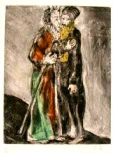 Marc Chagall was born in Vitebsk, Byelorussia, in 1887 to a poor Hasidic family. The eldest of nine children, Marc Chagall studied first in a heder before moving to a secular Russian school, where he began to display his artistic talent. With his mother's support, and despite his father's disapproval, Chagall pursued his interest in art, going to St. Petersburg in 1907 to study art with Leon Bakst. Influenced by contemporary Russian painting, Chagall's distinctive, child-like style, often centering on images from his childhood, began to emerge. From 1910 to 1914, Marc Chagall lived in Paris, and there absorbed the works of the leading cubist, surrealist, and fauvist painters. It was during this period that Chagall painted some of his most famous paintings of the Jewish shtetl or village, and developed the features that became recognizable trademarks of his art. Strong and often bright colors portray the world with a dreamlike, non-realistic simplicity, and the fusion of fantasy, religion, and nostalgia infuses his work with a joyous quality. Animals, workmen, lovers, and musicians populate his figures; the "fiddler on the roof" recurs frequently, often hovering within another scene. Chagall's work of this period displays the influence of contemporary French painting, but his style remains independent of any one school of art. He exhibited regularly in the Salon des Independants. In 1914, before the outbreak of World War I, Marc Chagall held a one-man show in Berlin, exhibiting work dominated by Jewish images and personages. During the war, he resided in Russia, and in 1917, endorsing the revolution, he was appointed Commissar for Fine Arts in Vitebsk and then director of the newly established Free Academy of Art. The Bolshevik authorities, however, frowned upon Chagall's style of art as too modern, and in 1922, Marc Chagall left Russia, settling in France one year later. He lived there permanently except for the years 1941 - 1948 when, fleeing France during World War II, he resided in the United States. Chagall's horror over the Nazi rise to power is expressed in works depicting Jewish martyrs and Jewish refugees. In addition to images of the Hassidic world, Chagall's paintings are inspired by themes from the Bible. His fascination with the Bible culminated in a series of over 100 etchings illustrating the Bible, many of which incorporate elements from Jewish folklore and from religious life in Vitebsk. Chagall's other illustrations include works by Gogol, La Fontaine, Y. L. Peretz, and his autobiographical Ma Vie (1931; My Life 1960) and Chagall by Chagall (1979) Marc Chagall painted with a variety of media, such as oils, water colors, and gouaches. His work also expanded to other forms of art, including ceramics, mosaics, and stained glass. Among his most famous building decorations are the ceiling of the Opera House in Paris, murals at the New York Metropolitan Opera, a glass window at the United Nations, and decorations at the Vatican Israel, which Marc Chagall first visited in 1931 for the opening of the Tel Aviv Art Museum, is likewise endowed with some of Chagall's work, most notably the twelve stained glass windows at Hadassah Hospital and wall decorations at the Knesset. Marc Chagall received many prizes and much recognition for his work. He was also one of very few artists to exhibit work at the Louvre in their lifetime. Marc Chagall's involvement with printmaking dates to 1922 and his return to Berlin after World War I. In the course of trying to recover the paintings he had left behind with Sturm Gallery's director Herwarth Walden in 1914, Walter Feilchenfeldt, the director of the Cassirer Gallery, offered to publish Chagall's then recently completed autobiography Mein Leben (My Life) to be illustrated with etchings. Although the book was never published due to translation problems, a suite of 20 etchings was created by the artist in the medium of dry-point etching depicting scenes and figures in Chagall's newly evolved naïve-realistic style. Chagall had never before been introduced to printmaking techniques and became very enamored with them, trying his hand with woodcuts and lithography, too. He felt that in these mediums his narrative flair had found its proper expression. Chagall wrote in 1960, "Since I started using a pencil, I have sought for this certain something that could spread like a stream toward unknown and alluring shores." And again, "When I held a lithographic stone or a copperplate in my hand I thought I was touching a talisman. It seemed to me that I could put all my joys and sorrows in it....Everything that touched my life through the years, births, deaths, weddings, flowers, animals, birds, the poor workers, my parents, lovers in the night, the biblical prophets, on the street, at home, in the temple and in heaven. And as I grew older, the tragedy of life within us and around us."1 It is in this sense that Chagall did lithographs, and they have become the stream that carries the message of his painting into the wide world. Fortuitously, it was a printmaking commission that brought Marc Chagall back to Paris in 1923. The famous dealer and editor, Ambroise Vollard, invited him to do some book illustrations and the artist requested the book be the Russian author Gogol's Dead Souls. So it was that Marc Chagall engraved 107 etchings on this theme in the course of only two years. Although in style they are related to the Mein Leben dry-points, their technique is obviously more elaborate and refined. Indicative of how the various creative mediums are related, the artist found that in the process of developing engraved imagery to illustrate Gogol he was able to revive his own Russian themes. As he had been longing to surround himself with the paintings he had lost in the course of WWI and his sojourn in Russia, he seized upon this inspiration to reconstruct many of his earlier missing canvasses. Other themes also evolved that were connected to his more recent Mo