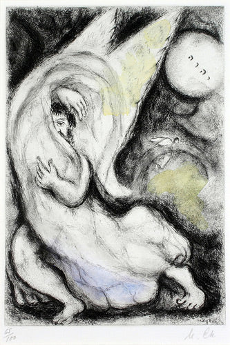 Marc Chagall was born in Vitebsk, Byelorussia, in 1887 to a poor Hasidic family. The eldest of nine children, Marc Chagall studied first in a heder before moving to a secular Russian school, where he began to display his artistic talent. With his mother's support, and despite his father's disapproval, Chagall pursued his interest in art, going to St. Petersburg in 1907 to study art with Leon Bakst. Influenced by contemporary Russian painting, Chagall's distinctive, child-like style, often centering on images from his childhood, began to emerge. From 1910 to 1914, Marc Chagall lived in Paris, and there absorbed the works of the leading cubist, surrealist, and fauvist painters. It was during this period that Chagall painted some of his most famous paintings of the Jewish shtetl or village, and developed the features that became recognizable trademarks of his art. Strong and often bright colors portray the world with a dreamlike, non-realistic simplicity, and the fusion of fantasy, religion, and nostalgia infuses his work with a joyous quality. Animals, workmen, lovers, and musicians populate his figures; the "fiddler on the roof" recurs frequently, often hovering within another scene. Chagall's work of this period displays the influence of contemporary French painting, but his style remains independent of any one school of art. He exhibited regularly in the Salon des Independants. In 1914, before the outbreak of World War I, Marc Chagall held a one-man show in Berlin, exhibiting work dominated by Jewish images and personages. During the war, he resided in Russia, and in 1917, endorsing the revolution, he was appointed Commissar for Fine Arts in Vitebsk and then director of the newly established Free Academy of Art. The Bolshevik authorities, however, frowned upon Chagall's style of art as too modern, and in 1922, Marc Chagall left Russia, settling in France one year later. He lived there permanently except for the years 1941 - 1948 when, fleeing France during World War II, he resided in the United States. Chagall's horror over the Nazi rise to power is expressed in works depicting Jewish martyrs and Jewish refugees. In addition to images of the Hassidic world, Chagall's paintings are inspired by themes from the Bible. His fascination with the Bible culminated in a series of over 100 etchings illustrating the Bible, many of which incorporate elements from Jewish folklore and from religious life in Vitebsk. Chagall's other illustrations include works by Gogol, La Fontaine, Y. L. Peretz, and his autobiographical Ma Vie (1931; My Life 1960) and Chagall by Chagall (1979) Marc Chagall painted with a variety of media, such as oils, water colors, and gouaches. His work also expanded to other forms of art, including ceramics, mosaics, and stained glass. Among his most famous building decorations are the ceiling of the Opera House in Paris, murals at the New York Metropolitan Opera, a glass window at the United Nations, and decorations at the Vatican Israel, which Marc Chagall first visited in 1931 for the opening of the Tel Aviv Art Museum, is likewise endowed with some of Chagall's work, most notably the twelve stained glass windows at Hadassah Hospital and wall decorations at the Knesset. Marc Chagall received many prizes and much recognition for his work. He was also one of very few artists to exhibit work at the Louvre in their lifetime. Marc Chagall's involvement with printmaking dates to 1922 and his return to Berlin after World War I. In the course of trying to recover the paintings he had left behind with Sturm Gallery's director Herwarth Walden in 1914, Walter Feilchenfeldt, the director of the Cassirer Gallery, offered to publish Chagall's then recently completed autobiography Mein Leben (My Life) to be illustrated with etchings. Although the book was never published due to translation problems, a suite of 20 etchings was created by the artist in the medium of dry-point etching depicting scenes and figures in Chagall's newly evolved naïve-realistic style. Chagall had never before been introduced to printmaking techniques and became very enamored with them, trying his hand with woodcuts and lithography, too. He felt that in these mediums his narrative flair had found its proper expression. Chagall wrote in 1960, "Since I started using a pencil, I have sought for this certain something that could spread like a stream toward unknown and alluring shores." And again, "When I held a lithographic stone or a copperplate in my hand I thought I was touching a talisman. It seemed to me that I could put all my joys and sorrows in it....Everything that touched my life through the years, births, deaths, weddings, flowers, animals, birds, the poor workers, my parents, lovers in the night, the biblical prophets, on the street, at home, in the temple and in heaven. And as I grew older, the tragedy of life within us and around us."1 It is in this sense that Chagall did lithographs, and they have become the stream that carries the message of his painting into the wide world. Fortuitously, it was a printmaking commission that brought Marc Chagall back to Paris in 1923. The famous dealer and editor, Ambroise Vollard, invited him to do some book illustrations and the artist requested the book be the Russian author Gogol's Dead Souls. So it was that Marc Chagall engraved 107 etchings on this theme in the course of only two years. Although in style they are related to the Mein Leben dry-points, their technique is obviously more elaborate and refined. Indicative of how the various creative mediums are related, the artist found that in the process of developing engraved imagery to illustrate Gogol he was able to revive his own Russian themes. As he had been longing to surround himself with the paintings he had lost in the course of WWI and his sojourn in Russia, he seized upon this inspiration to reconstruct many of his earlier missing canvasses. Other themes also evolved that were connected to his more recent Mo