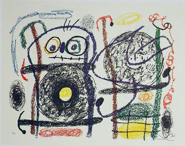 Joan Miro was born April 20, 1893 in Barcelona, Spain. Like Pablo Picasso, Henri Matisse, and Salvador Dali, Miro is one of the great pioneers of twentieth-century art. Miro began drawing at a young age, and his choice of subjects -tufts of grass, insects, birds- revealed an early affinity for the organic. Though based on his observations of nature, his works were abstractions, and bridged the gap between realistic and abstract imagery. The Surrealist concept of automatism (allowing the subconscious to dictate visual forms) helped to drive Miro's imagination throughout his career. As a result he produced vivid biomorphic imagery. Miro also identified strongly with the Surrealist poets, and collaborated with them on many artists books, to which he would contribute illustrations. In the 1960s, Miro devoted more time to printmaking, creating lithographs, etchings and aquatints. Miro was attracted to printmaking and sculpture as a respite from the solitary nature of painting, and as an opportunity to work together printers and other artisans. These experiences enhanced Miro's own creative repertoire. For instance, one notices the caligraphic nature of Miro's Femme dans la nuit ('Woman in the Night'), a wax crayona dn watercolor composition from 1967-1971, which could easily have been conceived as a study for a lithograph, despite its size and being of mixed-media. Miro recognized an advantage in printmaking, stating: "A painting is a unique example for a single collector. But if I pull seventy-five examples, I increase by seventy-five times the number of people who can own a work of mine. I increase the reach of my message seventy-five times." Miro died on December 25,1983, in Palma de Mallorca, Spain.