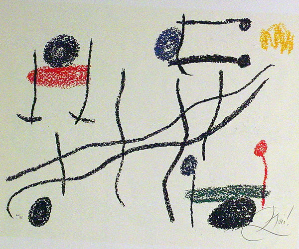 Joan Miro was born April 20, 1893 in Barcelona, Spain. Like Pablo Picasso, Henri Matisse, and Salvador Dali, Miro is one of the great pioneers of twentieth-century art. Miro began drawing at a young age, and his choice of subjects -tufts of grass, insects, birds- revealed an early affinity for the organic. Though based on his observations of nature, his works were abstractions, and bridged the gap between realistic and abstract imagery. The Surrealist concept of automatism (allowing the subconscious to dictate visual forms) helped to drive Miro's imagination throughout his career. As a result he produced vivid biomorphic imagery. Miro also identified strongly with the Surrealist poets, and collaborated with them on many artists books, to which he would contribute illustrations. In the 1960s, Miro devoted more time to printmaking, creating lithographs, etchings and aquatints. Miro was attracted to printmaking and sculpture as a respite from the solitary nature of painting, and as an opportunity to work together printers and other artisans. These experiences enhanced Miro's own creative repertoire. For instance, one notices the caligraphic nature of Miro's Femme dans la nuit ('Woman in the Night'), a wax crayona dn watercolor composition from 1967-1971, which could easily have been conceived as a study for a lithograph, despite its size and being of mixed-media. Miro recognized an advantage in printmaking, stating: "A painting is a unique example for a single collector. But if I pull seventy-five examples, I increase by seventy-five times the number of people who can own a work of mine. I increase the reach of my message seventy-five times." Miro died on December 25,1983, in Palma de Mallorca, Spain.