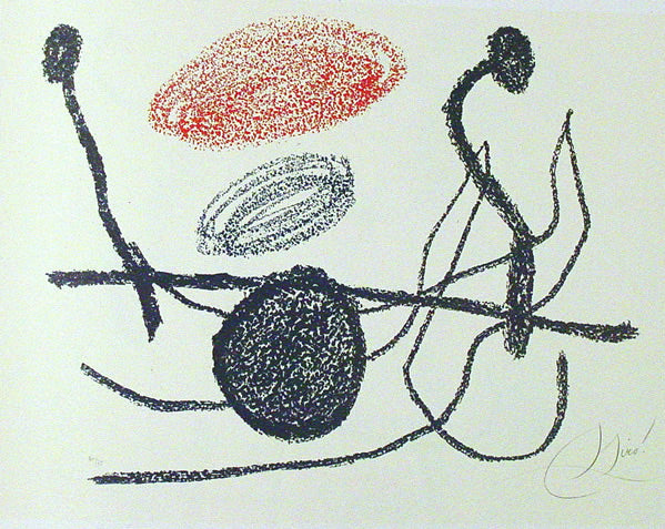 Joan Miro was born April 20, 1893 in Barcelona, Spain. Like Pablo Picasso, Henri Matisse, and Salvador Dali, Miro is one of the great pioneers of twentieth-century art. Miro began drawing at a young age, and his choice of subjects -tufts of grass, insects, birds- revealed an early affinity for the organic. Though based on his observations of nature, his works were abstractions, and bridged the gap between realistic and abstract imagery. The Surrealist concept of automatism (allowing the subconscious to dictate visual forms) helped to drive Miro's imagination throughout his career. As a result he produced vivid biomorphic imagery. Miro also identified strongly with the Surrealist poets, and collaborated with them on many artists books, to which he would contribute illustrations. In the 1960s, Miro devoted more time to printmaking, creating lithographs, etchings and aquatints. Miro was attracted to printmaking and sculpture as a respite from the solitary nature of painting, and as an opportunity to work together printers and other artisans. These experiences enhanced Miro's own creative repertoire. For instance, one notices the caligraphic nature of Miro's Femme dans la nuit ('Woman in the Night'), a wax crayona dn watercolor composition from 1967-1971, which could easily have been conceived as a study for a lithograph, despite its size and being of mixed-media. Miro recognized an advantage in printmaking, stating: "A painting is a unique example for a single collector. But if I pull seventy-five examples, I increase by seventy-five times the number of people who can own a work of mine. I increase the reach of my message seventy-five times." Miro died on December 25,1983, in Palma de Mallorca, Spain.