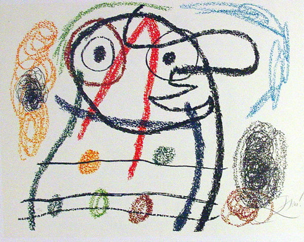 Joan Miro was born April 20, 1893 in Barcelona, Spain. Like Pablo Picasso, Henri Matisse, and Salvador Dali, Miro is one of the great pioneers of twentieth-century art. Miro began drawing at a young age, and his choice of subjects -tufts of grass, insects, birds- revealed an early affinity for the organic. Though based on his observations of nature, his works were abstractions, and bridged the gap between realistic and abstract imagery. The Surrealist concept of automatism (allowing the subconscious to dictate visual forms) helped to drive Miro's imagination throughout his career. As a result he produced vivid biomorphic imagery. Miro also identified strongly with the Surrealist poets, and collaborated with them on many artists books, to which he would contribute illustrations. In the 1960s, Miro devoted more time to printmaking, creating lithographs, etchings and aquatints. Miro was attracted to printmaking and sculpture as a respite from the solitary nature of painting, and as an opportunity to work together printers and other artisans. These experiences enhanced Miro's own creative repertoire. For instance, one notices the caligraphic nature of Miro's Femme dans la nuit ('Woman in the Night'), a wax crayona dn watercolor composition from 1967-1971, which could easily have been conceived as a study for a lithograph, despite its size and being of mixed-media. Miro recognized an advantage in printmaking, stating: "A painting is a unique example for a single collector. But if I pull seventy-five examples, I increase by seventy-five times the number of people who can own a work of mine. I increase the reach of my message seventy-five times." Miro died on December 25,1983, in Palma de Mallorca, Spain.