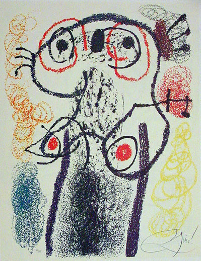 Joan Miro was born April 20, 1893 in Barcelona, Spain. Like Pablo Picasso, Henri Matisse, and Salvador Dali, Miro is one of the great pioneers of twentieth-century art. Miro began drawing at a young age, and his choice of subjects -tufts of grass, insects, birds- revealed an early affinity for the organic. Though based on his observations of nature, his works were abstractions, and bridged the gap between realistic and abstract imagery. The Surrealist concept of automatism (allowing the subconscious to dictate visual forms) helped to drive Miro's imagination throughout his career. As a result he produced vivid biomorphic imagery. Miro also identified strongly with the Surrealist poets, and collaborated with them on many artists books, to which he would contribute illustrations. In the 1960s, Miro devoted more time to printmaking, creating lithographs, etchings and aquatints. Miro was attracted to printmaking and sculpture as a respite from the solitary nature of painting, and as an opportunity to work together printers and other artisans. These experiences enhanced Miro's own creative repertoire. For instance, one notices the caligraphic nature of Miro's Femme dans la nuit ('Woman in the Night'), a wax crayona dn watercolor composition from 1967-1971, which could easily have been conceived as a study for a lithograph, despite its size and being of mixed-media. Miro recognized an advantage in printmaking, stating: "A painting is a unique example for a single collector. But if I pull seventy-five examples, I increase by seventy-five times the number of people who can own a work of mine. I increase the reach of my message seventy-five times." Miro died on December 25,1983, in Palma de Mallorca, Spain.