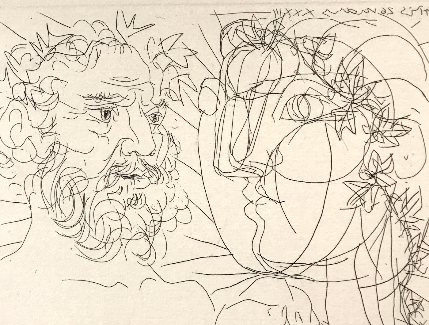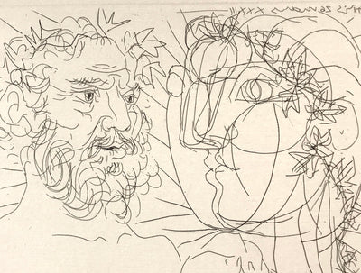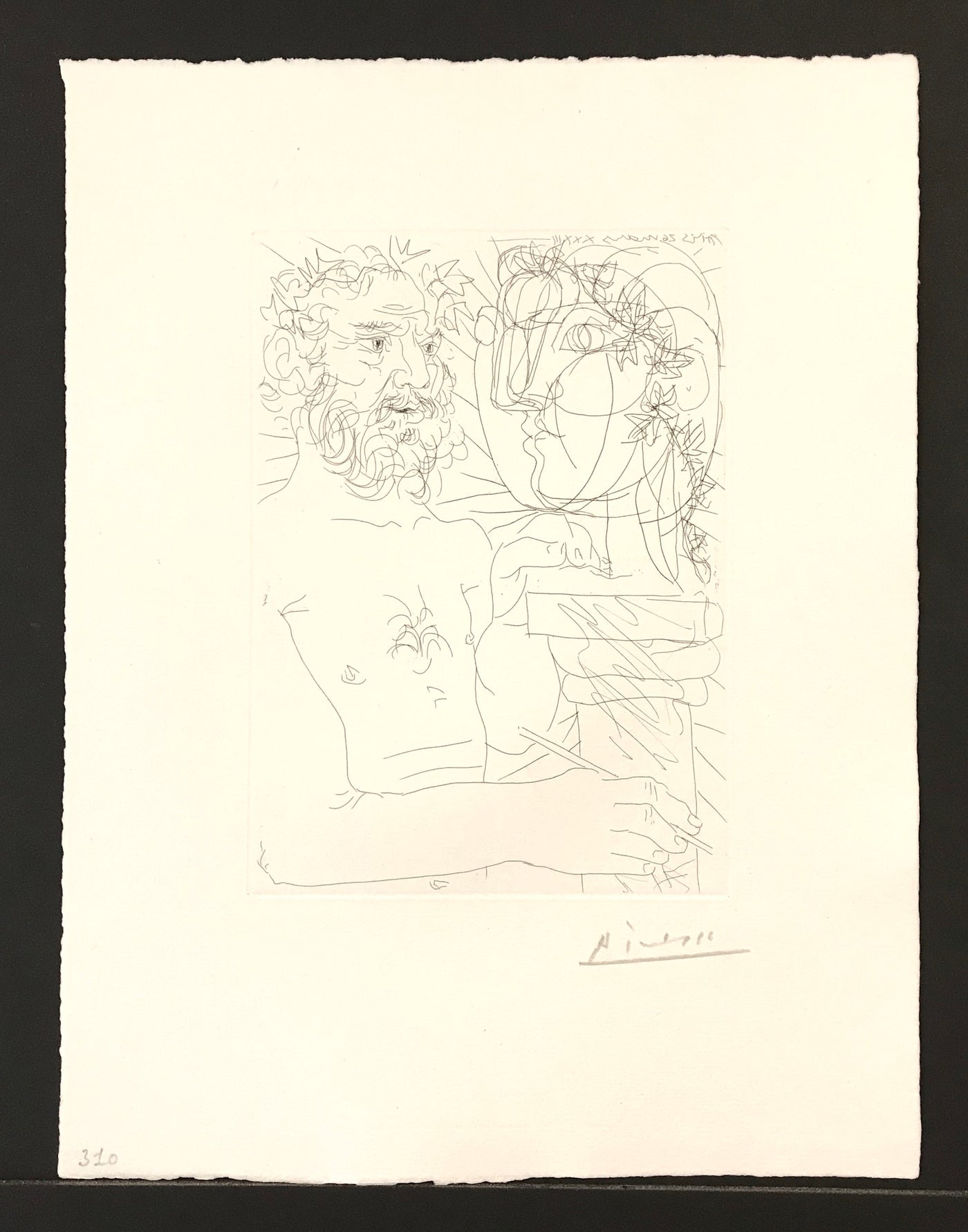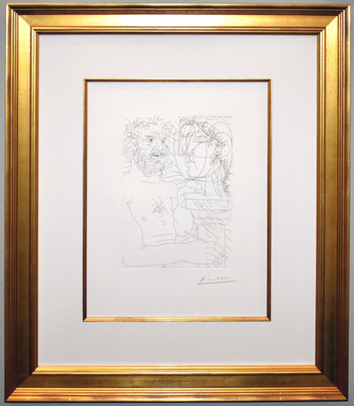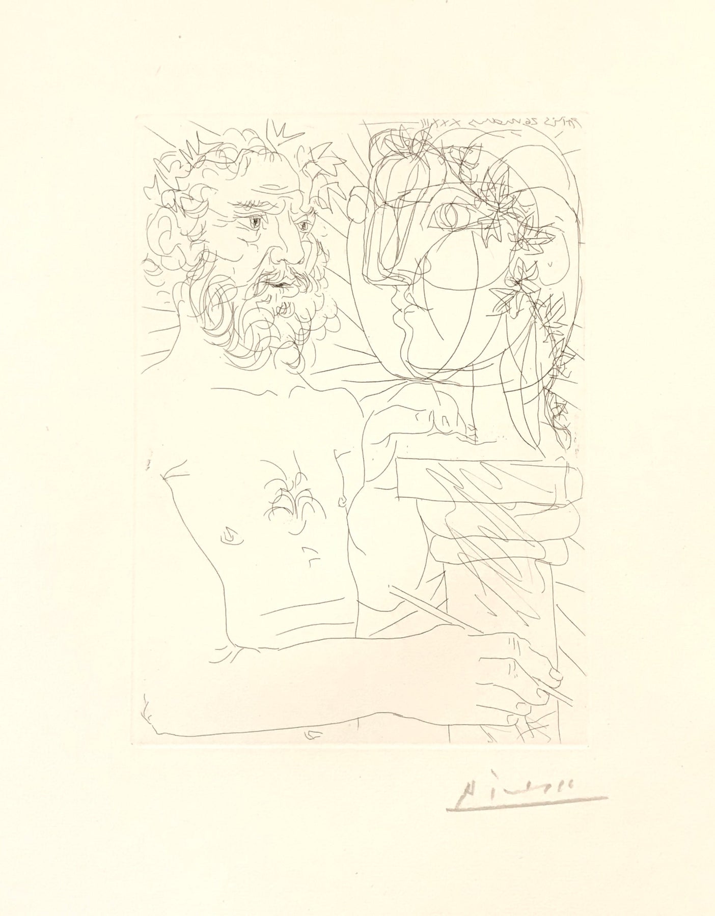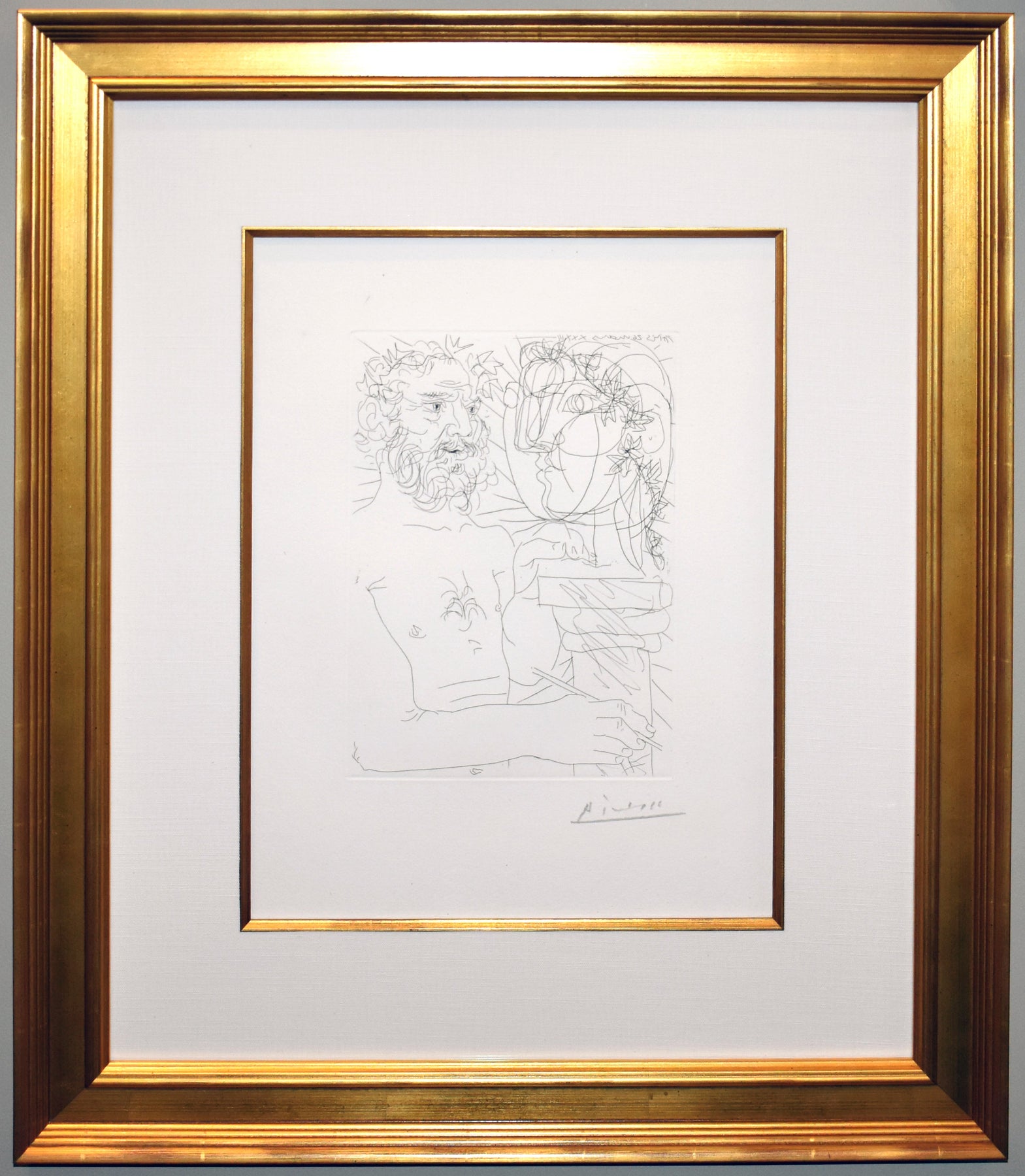 Old Sculptor at Work II is number 49 in the famed Vollard Suite (La Suite Vollard), a sequence of 100 etchings Picasso produced throughout the 1930s. They were printed in 1937 by Roger Lacouri√®re, and a portion of the prints were hand signed by Picasso in pencil between 1945 and 1969. --- Pablo Picasso was born on October 25, 1881, in Málaga, Spain. The son of an academic painter, José Ruiz Blanco, he began to draw at an early age. In 1895, the Picasso family moved to Barcelona. It was there that Pablo studied at La Lonja, the local academy of fine arts. His association with the patrons of the café Els Quatre Gats in the late 1890s was crucial to his early artistic development in that the café was a nexus of social life among artists, authors, musicians, and the like, as well as the site of several music performances and tertulias ('literary gatherings'). In 1900, Pablo Picasso's first exhibition took place in Barcelona, and in the fall of the same year he visited Paris for the first time. It was in Paris where he observed the paintings of Edouard Manet, Gustave Courbet, and Henri Toulouse-Lautrec. He settled there in April 1904, and soon his circle of friends included the poet Guillaume Apollinaire, writer Max Jacob, Gertrude and Leo Stein, and art dealers Ambroise Vollard and Berthe Weill. Picasso's visual style and choice of subject matter developed dramatically over a short period of time. The time between 1901 and 1904 has come be known as his 'Blue Period,' 1905 his 'Rose Period,' from 1908 to 1911 his Analytic Cubist phase, and from 1912 forward his Synthetic Cubist phase. The Blue Period is named for Picasso's color palette at the time, and is distinguished by its subject matter: vagrants, outcasts, prostitutes, and otherwise marginalized people. The Rose Period marked a brightening of Picasso's palette: pinks, beiges, roses, and light blues. His choice of subject matter followed suit: clowns, harlequins, and saltimbanques ('circus people'). Picasso's name is synonymous with the development of Cubism, which is the permutation of several artistic trends and of the styles of certain artists. Through Gertrude and Leo Stein, Picasso knew Henri Matisse, who had stirred audiences in 1905 with paintings displaying harsh, dissonant colors. Critics chided Matisse's paintings, while Picasso admired them. He also admired the so-called 'primitive' works of Henri Rousseau. While in Paris, Picasso frequented the Musée d'Ethnographie du Trocadéro, where he saw works of indigenous African art, and in Spain discovered ancient Iberian sculpture. Through a collaboration with the artist Georges Braque, Picasso gradually combined his influences into a wholly original style, which fragmented three-dimensional forms into abstract geometric shapes that intertwined and overlapped each other. His first major Cubist work was the renowned Les Demoiselles d'Avignon, which he completed in 1907 but didn't not show to anyone until 1916. By 1936, the Spanish Civil War affected Pablo Picasso immensely, and the following year he completed Guernica, which depicts the bombing of the Spanish city of the same name. Picasso's association with the Communist Party began in 1944, and in the latter half of the decade he lived in the southern France. Among the large number of Picasso exhibitions that were held during the artist's lifetime, those at Museum of Modern Art in New York in 1939 and at the Musée des Arts Décoratifs in Paris in 1955 were the most significant. In 1961, the artist married Jacqueline Roque, and they moved to the town of Mougins. He continued to work in painting, drawing, prints, ceramics, and sculpture there until his death on April 8, 1973.