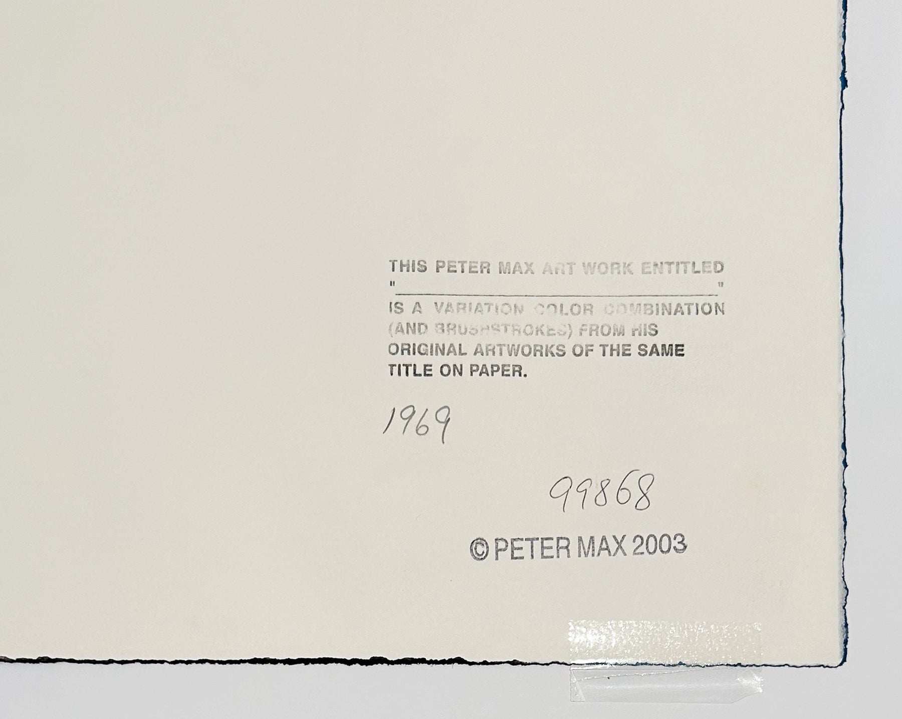In the 1960s, Max rose to youthful prominence with his famous style, a bold, linear form of painting which employed shocking color juxtapositions and depicted transcendental themes. As his expressionistic style evolved, becoming more sensuous and painterly, his unique symbolism and vibrant color palette have continued to inspire new generations of Americans for decades. In 1964 he closed the studio to go into "creative retreat." It was then that he began making colorful, mind-expanding silkscreens. His second retreat was from 1972 until 1976, during that time he created the first "Preserve the Environment" Postage Stamp commemorating Expo 74 for the World Fair in Spokane, Washington. In 1976, he was selected to paint 235 border murals at entry points to Canada and Mexico. The same year, he created a painting of each of the 50 states, resulting in a book, Peter Max Paints America, dedicated to the Bicentennial.