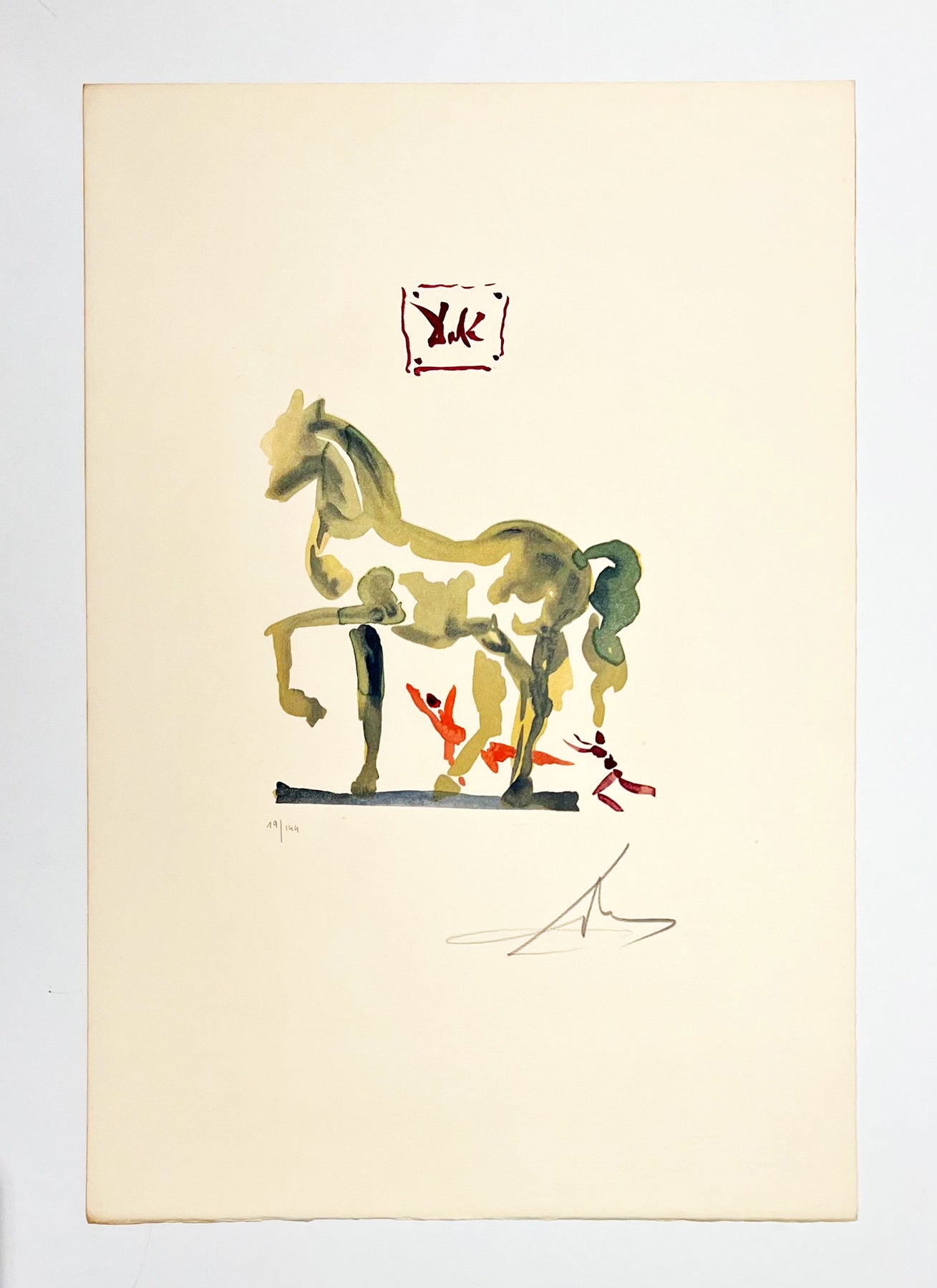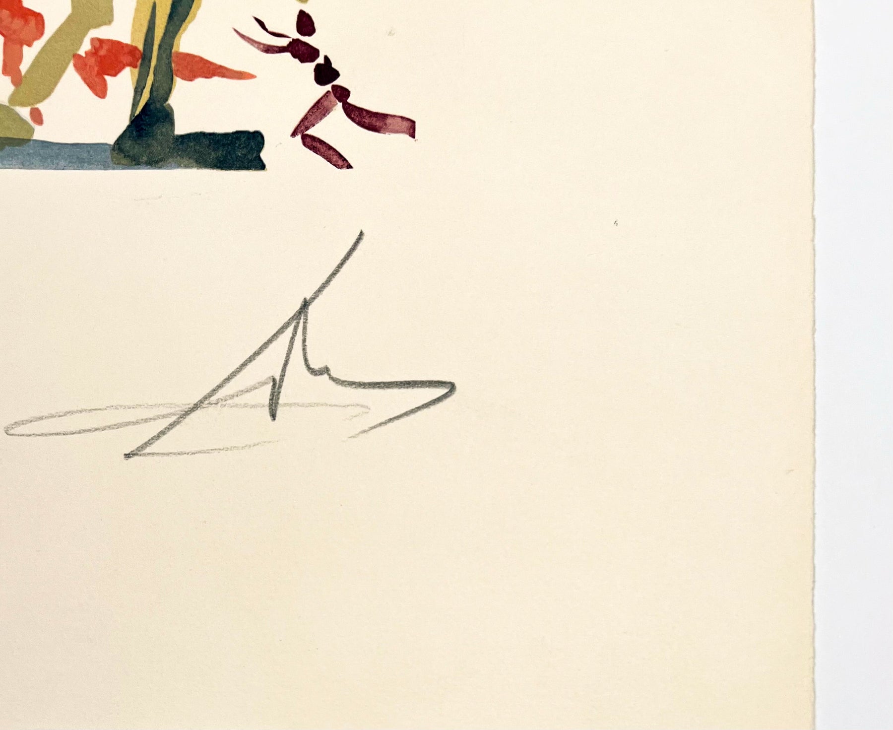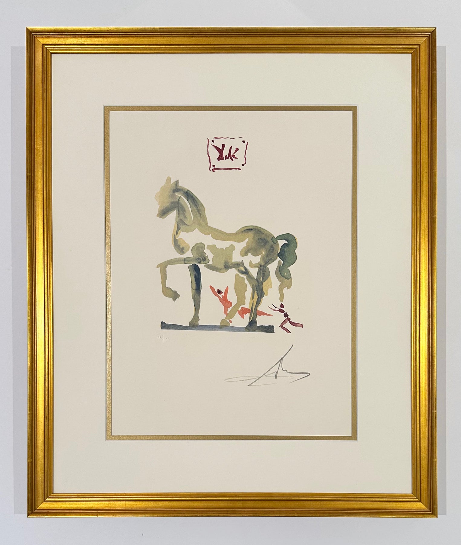 The surrealist Salvador Dali is considered to be one of the masters of 20th-Century art. His work juxtaposes a meticulous academic technique with depictions of hallucinatory characters in fantastic dreamscapes. He described his art as 'hand-painted dream photographs,' and had certain preferred and recurring images, such as the human figure with half-open drawers protruding from it, burning giraffes, and watches bent and flowing as if made from melting wax. Salvador Domenec Felip Jacint Dali Domenech was born May 11, 1904 in Figueras, Catalonia, Spain. His father, a prominent notary, encouraged his artistic inclinations and arranged for drawing lessons at age ten from the Spanish impressionist painter, Ramon Pichot. At eighteen, Dali moved to Madrid to study painting at the Academy of Arts. He developed a reputation as an eccentric, attracting attention with his manner of dress, hairstyle, and provocative comments on art. The artist experimented with forms of Cubism and Dadaism during his studies. Dali was expelled before final exams, after asserting that those judging his work were not competent enough to grade him. After leaving the Academy, Dali went to Paris where he met Spanish painters Pablo Picasso and Joan Miro. He established himself as the principal figure of a group of surrealist artists grouped around French poet Andre Breton. The surrealists hailed what Dali called the 'paranoiac-critical' method of accessing the subconscious for greater artistic creativity. Essentially, it is the ability of the artist or the viewer to perceive multiple images within the same configuration and a process through which Dali found new and unique ways to view the world around him. Years later Breton turned away from Dali, accusing him of supporting fascism, excessive self-presentation, and financial greediness. He was officially expelled from the group in 1934, in part because of his controversial political views, and was henceforth spoken about by the surrealists in past-tense, as if he were dead. Breton later coined the nickname Avida Dollars for Dali, an anagram of his name meaning 'greedy for dollars.' In addition to Surrealism, psychologist Dr. Sigmund Freud's theory of the unconscious -introduced to Dali in Freud's book The Interpretation of Dreams- also strongly influenced Dali's work and philosophy. Throughout the 1920s and early 1930s, Dali perfected the personal style that made him famous: a world of the unconscious that is recalled during one's dreams. In his work, he would juxtapose incongruous, unrelated, and often bizarre objects against desolate landscapes. This disturbing blend of precise realism and dreamlike fantasy became his hallmark. In 1929, Dali met his wife-to-be Gala. Gala (born Elena Ivanovna Diakonova), a Russian immigrant eleven years his senior, was then married to the surrealist poet Paul Éluard. Dali and Gala were married in a civil service in 1934, and again in a church after Eluard's death. Gala was Dali's muse, inspiration, lover, and model, as well as his business manager. Dali had his first one-man show in New York in 1933. With a $500 loan from Pablo Picasso, Dali was able to visit the United States for the first time a year later. In the late 1930s, he made several trips to Italy to study the art of the sixteenth and seventeenth centuries, eventually becaming an admirer of Raphael. In 1940, Dali and Gala claimed permanent residency in the United States in order to evade World War II. During his eight years in the U.S., Dali found great success, having a series of spectacular exhibitions, including a retrospective show at the Museum of Modern Art in New York. He also understood how the media worked and used it to its full potential. His attention seeking comments and flamboyant appearance -a long cape, walking stick, haughty expression, and upturned waxed mustache- helped raise him to celebrity status. He once famously said: "Every morning upon awakening, I experience a supreme pleasure: that of being Salvador Dali." His persona brought him numerous patrons. He executed portraits commissioned by celebrities such as Helena Rubinstein or Jack Warner, designed jewelry for Coco Chanel, and even storyboarded the Walt Disney short film Destiny and designed a dream sequence for Alfred Hitchcock's Spellbound. Dali had been producing limited edition prints as early as the 1930s, however the images he created in the 1960s with publishers Sidney and Phyllis Lucas are considered by collectors the apex of Dali's lithographs. His publishers encouraged the incorporation of classical themes with Surrealism, and together they assembled fascinating graphic works. Gala died in 1982, and Dali's health deteriorated thereafter. He suffered from palsy, and had injuries from a suspicious fire in his house in Pubol in 1984. The end of his life was spent in seclusion, first in Pubol and later in his apartments at Torre Galatea. Dali died on January 23, 1989 in his birth town, Figueras.