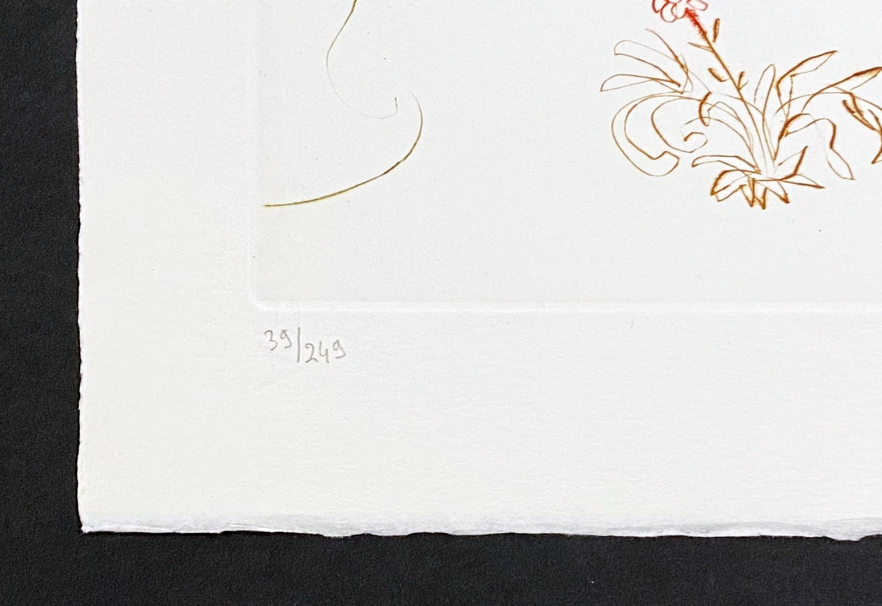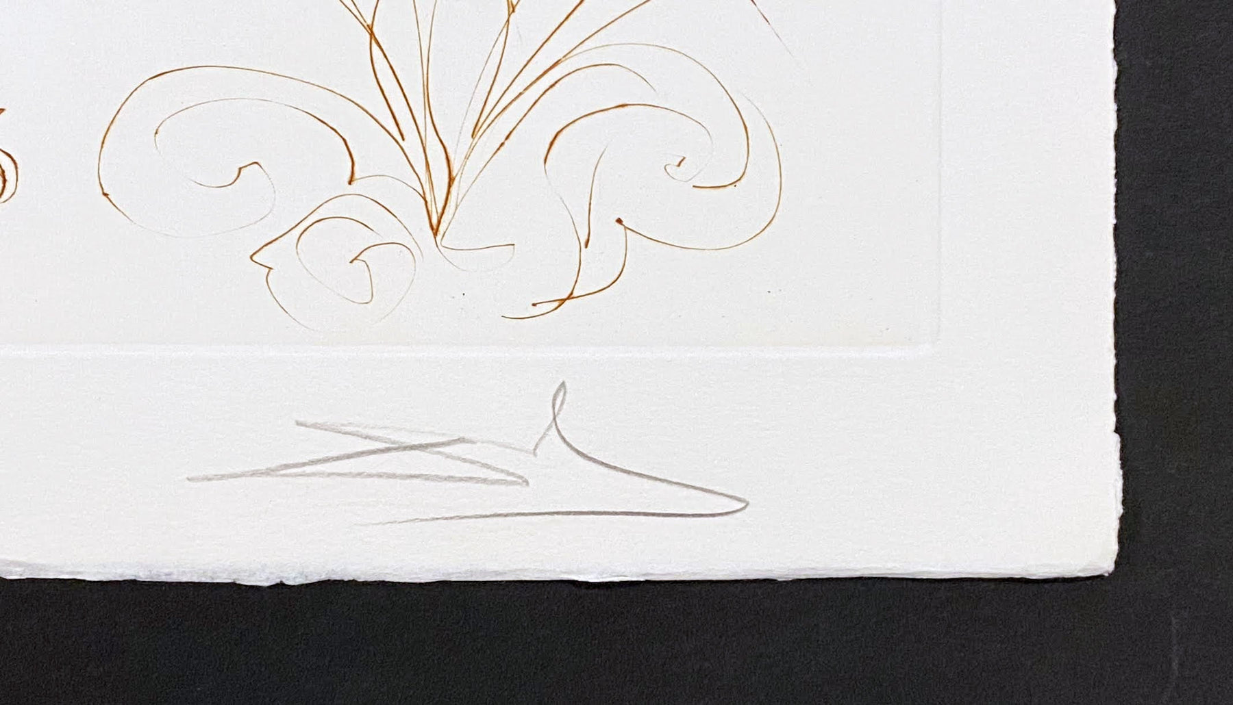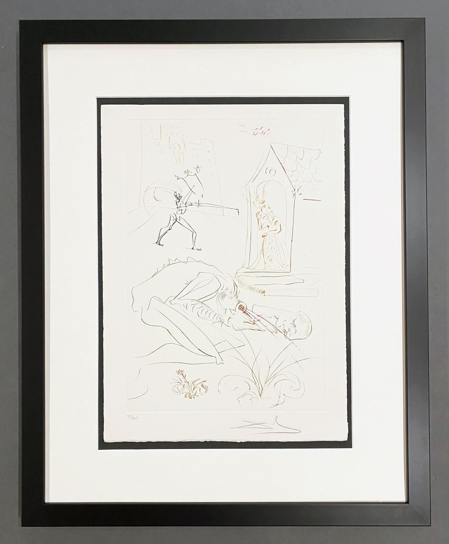 The surrealist Salvador Dali is considered to be one of the masters of 20th-Century art. His work juxtaposes a meticulous academic technique with depictions of hallucinatory characters in fantastic dreamscapes. He described his art as 'hand-painted dream photographs,' and had certain preferred and recurring images, such as the human figure with half-open drawers protruding from it, burning giraffes, and watches bent and flowing as if made from melting wax. Salvador Domenec Felip Jacint Dali Domenech was born May 11, 1904 in Figueras, Catalonia, Spain. His father, a prominent notary, encouraged his artistic inclinations and arranged for drawing lessons at age ten from the Spanish impressionist painter, Ramon Pichot. At eighteen, Dali moved to Madrid to study painting at the Academy of Arts. He developed a reputation as an eccentric, attracting attention with his manner of dress, hairstyle, and provocative comments on art. The artist experimented with forms of Cubism and Dadaism during his studies. Dali was expelled before final exams, after asserting that those judging his work were not competent enough to grade him. After leaving the Academy, Dali went to Paris where he met Spanish painters Pablo Picasso and Joan Miro. He established himself as the principal figure of a group of surrealist artists grouped around French poet Andre Breton. The surrealists hailed what Dali called the 'paranoiac-critical' method of accessing the subconscious for greater artistic creativity. Essentially, it is the ability of the artist or the viewer to perceive multiple images within the same configuration and a process through which Dali found new and unique ways to view the world around him. Years later Breton turned away from Dali, accusing him of supporting fascism, excessive self-presentation, and financial greediness. He was officially expelled from the group in 1934, in part because of his controversial political views, and was henceforth spoken about by the surrealists in past-tense, as if he were dead. Breton later coined the nickname Avida Dollars for Dali, an anagram of his name meaning 'greedy for dollars.' In addition to Surrealism, psychologist Dr. Sigmund Freud's theory of the unconscious -introduced to Dali in Freud's book The Interpretation of Dreams- also strongly influenced Dali's work and philosophy. Throughout the 1920s and early 1930s, Dali perfected the personal style that made him famous: a world of the unconscious that is recalled during one's dreams. In his work, he would juxtapose incongruous, unrelated, and often bizarre objects against desolate landscapes. This disturbing blend of precise realism and dreamlike fantasy became his hallmark. In 1929, Dali met his wife-to-be Gala. Gala (born Elena Ivanovna Diakonova), a Russian immigrant eleven years his senior, was then married to the surrealist poet Paul Éluard. Dali and Gala were married in a civil service in 1934, and again in a church after Eluard's death. Gala was Dali's muse, inspiration, lover, and model, as well as his business manager. Dali had his first one-man show in New York in 1933. With a $500 loan from Pablo Picasso, Dali was able to visit the United States for the first time a year later. In the late 1930s, he made several trips to Italy to study the art of the sixteenth and seventeenth centuries, eventually becaming an admirer of Raphael. In 1940, Dali and Gala claimed permanent residency in the United States in order to evade World War II. During his eight years in the U.S., Dali found great success, having a series of spectacular exhibitions, including a retrospective show at the Museum of Modern Art in New York. He also understood how the media worked and used it to its full potential. His attention seeking comments and flamboyant appearance -a long cape, walking stick, haughty expression, and upturned waxed mustache- helped raise him to celebrity status. He once famously said: "Every morning upon awakening, I experience a supreme pleasure: that of being Salvador Dali." His persona brought him numerous patrons. He executed portraits commissioned by celebrities such as Helena Rubinstein or Jack Warner, designed jewelry for Coco Chanel, and even storyboarded the Walt Disney short film Destiny and designed a dream sequence for Alfred Hitchcock's Spellbound. Dali had been producing limited edition prints as early as the 1930s, however the images he created in the 1960s with publishers Sidney and Phyllis Lucas are considered by collectors the apex of Dali's lithographs. His publishers encouraged the incorporation of classical themes with Surrealism, and together they assembled fascinating graphic works. Gala died in 1982, and Dali's health deteriorated thereafter. He suffered from palsy, and had injuries from a suspicious fire in his house in Pubol in 1984. The end of his life was spent in seclusion, first in Pubol and later in his apartments at Torre Galatea. Dali died on January 23, 1989 in his birth town, Figueras.