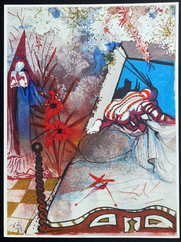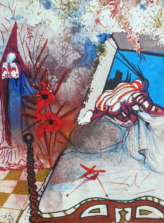 The surrealist Salvador Dali is considered to be one of the masters of 20th-Century art. His work juxtaposes a meticulous academic technique with depictions of hallucinatory characters in fantastic dreamscapes. He described his art as 'hand-painted dream photographs,' and had certain preferred and recurring images, such as the human figure with half-open drawers protruding from it, burning giraffes, and watches bent and flowing as if made from melting wax. Salvador Domenec Felip Jacint Dali Domenech was born May 11, 1904 in Figueras, Catalonia, Spain. His father, a prominent notary, encouraged his artistic inclinations and arranged for drawing lessons at age ten from the Spanish impressionist painter, Ramon Pichot. At eighteen, Dali moved to Madrid to study painting at the Academy of Arts. He developed a reputation as an eccentric, attracting attention with his manner of dress, hairstyle, and provocative comments on art. The artist experimented with forms of Cubism and Dadaism during his studies. Dali was expelled before final exams, after asserting that those judging his work were not competent enough to grade him. After leaving the Academy, Dali went to Paris where he met Spanish painters Pablo Picasso and Joan Miro. He established himself as the principal figure of a group of surrealist artists grouped around French poet Andre Breton. The surrealists hailed what Dali called the 'paranoiac-critical' method of accessing the subconscious for greater artistic creativity. Essentially, it is the ability of the artist or the viewer to perceive multiple images within the same configuration and a process through which Dali found new and unique ways to view the world around him. Years later Breton turned away from Dali, accusing him of supporting fascism, excessive self-presentation, and financial greediness. He was officially expelled from the group in 1934, in part because of his controversial political views, and was henceforth spoken about by the surrealists in past-tense, as if he were dead. Breton later coined the nickname Avida Dollars for Dali, an anagram of his name meaning 'greedy for dollars.' In addition to Surrealism, psychologist Dr. Sigmund Freud's theory of the unconscious -introduced to Dali in Freud's book The Interpretation of Dreams- also strongly influenced Dali's work and philosophy. Throughout the 1920s and early 1930s, Dali perfected the personal style that made him famous: a world of the unconscious that is recalled during one's dreams. In his work, he would juxtapose incongruous, unrelated, and often bizarre objects against desolate landscapes. This disturbing blend of precise realism and dreamlike fantasy became his hallmark. In 1929, Dali met his wife-to-be Gala. Gala (born Elena Ivanovna Diakonova), a Russian immigrant eleven years his senior, was then married to the surrealist poet Paul Éluard. Dali and Gala were married in a civil service in 1934, and again in a church after Eluard's death. Gala was Dali's muse, inspiration, lover, and model, as well as his business manager. Dali had his first one-man show in New York in 1933. With a $500 loan from Pablo Picasso, Dali was able to visit the United States for the first time a year later. In the late 1930s, he made several trips to Italy to study the art of the sixteenth and seventeenth centuries, eventually becaming an admirer of Raphael. In 1940, Dali and Gala claimed permanent residency in the United States in order to evade World War II. During his eight years in the U.S., Dali found great success, having a series of spectacular exhibitions, including a retrospective show at the Museum of Modern Art in New York. He also understood how the media worked and used it to its full potential. His attention seeking comments and flamboyant appearance -a long cape, walking stick, haughty expression, and upturned waxed mustache- helped raise him to celebrity status. He once famously said: "Every morning upon awakening, I experience a supreme pleasure: that of being Salvador Dali." His persona brought him numerous patrons. He executed portraits commissioned by celebrities such as Helena Rubinstein or Jack Warner, designed jewelry for Coco Chanel, and even storyboarded the Walt Disney short film Destiny and designed a dream sequence for Alfred Hitchcock's Spellbound. Dali had been producing limited edition prints as early as the 1930s, however the images he created in the 1960s with publishers Sidney and Phyllis Lucas are considered by collectors the apex of Dali's lithographs. His publishers encouraged the incorporation of classical themes with Surrealism, and together they assembled fascinating graphic works. Gala died in 1982, and Dali's health deteriorated thereafter. He suffered from palsy, and had injuries from a suspicious fire in his house in Pubol in 1984. The end of his life was spent in seclusion, first in Pubol and later in his apartments at Torre Galatea. Dali died on January 23, 1989 in his birth town, Figueras.