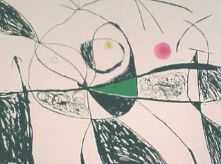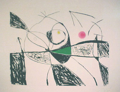 Joan Miro was born April 20, 1893 in Barcelona, Spain. Like Pablo Picasso, Henri Matisse, and Salvador Dali, Miro is one of the great pioneers of twentieth-century art. Miro began drawing at a young age, and his choice of subjects -tufts of grass, insects, birds- revealed an early affinity for the organic. Though based on his observations of nature, his works were abstractions, and bridged the gap between realistic and abstract imagery. The Surrealist concept of automatism (allowing the subconscious to dictate visual forms) helped to drive Miro's imagination throughout his career. As a result he produced vivid biomorphic imagery. Miro also identified strongly with the Surrealist poets, and collaborated with them on many artists books, to which he would contribute illustrations. In the 1960s, Miro devoted more time to printmaking, creating lithographs, etchings and aquatints. Miro was attracted to printmaking and sculpture as a respite from the solitary nature of painting, and as an opportunity to work together printers and other artisans. These experiences enhanced Miro's own creative repertoire. For instance, one notices the caligraphic nature of Miro's Femme dans la nuit ('Woman in the Night'), a wax crayona dn watercolor composition from 1967-1971, which could easily have been conceived as a study for a lithograph, despite its size and being of mixed-media. Miro recognized an advantage in printmaking, stating: "A painting is a unique example for a single collector. But if I pull seventy-five examples, I increase by seventy-five times the number of people who can own a work of mine. I increase the reach of my message seventy-five times." Miro died on December 25,1983, in Palma de Mallorca, Spain.