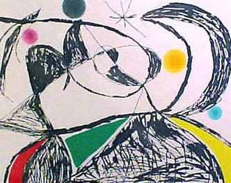 Joan Miro was born April 20, 1893 in Barcelona, Spain. Like Pablo Picasso, Henri Matisse, and Salvador Dali, Miro is one of the great pioneers of twentieth-century art. Miro began drawing at a young age, and his choice of subjects -tufts of grass, insects, birds- revealed an early affinity for the organic. Though based on his observations of nature, his works were abstractions, and bridged the gap between realistic and abstract imagery. The Surrealist concept of automatism (allowing the subconscious to dictate visual forms) helped to drive Miro's imagination throughout his career. As a result he produced vivid biomorphic imagery. Miro also identified strongly with the Surrealist poets, and collaborated with them on many artists books, to which he would contribute illustrations. In the 1960s, Miro devoted more time to printmaking, creating lithographs, etchings and aquatints. Miro was attracted to printmaking and sculpture as a respite from the solitary nature of painting, and as an opportunity to work together printers and other artisans. These experiences enhanced Miro's own creative repertoire. For instance, one notices the caligraphic nature of Miro's Femme dans la nuit ('Woman in the Night'), a wax crayona dn watercolor composition from 1967-1971, which could easily have been conceived as a study for a lithograph, despite its size and being of mixed-media. Miro recognized an advantage in printmaking, stating: "A painting is a unique example for a single collector. But if I pull seventy-five examples, I increase by seventy-five times the number of people who can own a work of mine. I increase the reach of my message seventy-five times." Miro died on December 25,1983, in Palma de Mallorca, Spain.