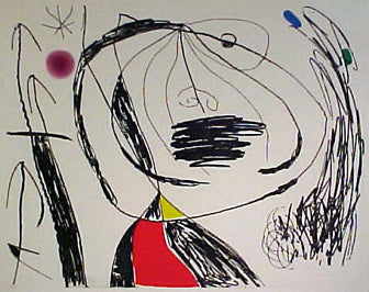 Joan Miro was born April 20, 1893 in Barcelona, Spain. Like Pablo Picasso, Henri Matisse, and Salvador Dali, Miro is one of the great pioneers of twentieth-century art. Miro began drawing at a young age, and his choice of subjects -tufts of grass, insects, birds- revealed an early affinity for the organic. Though based on his observations of nature, his works were abstractions, and bridged the gap between realistic and abstract imagery. The Surrealist concept of automatism (allowing the subconscious to dictate visual forms) helped to drive Miro's imagination throughout his career. As a result he produced vivid biomorphic imagery. Miro also identified strongly with the Surrealist poets, and collaborated with them on many artists books, to which he would contribute illustrations. In the 1960s, Miro devoted more time to printmaking, creating lithographs, etchings and aquatints. Miro was attracted to printmaking and sculpture as a respite from the solitary nature of painting, and as an opportunity to work together printers and other artisans. These experiences enhanced Miro's own creative repertoire. For instance, one notices the caligraphic nature of Miro's Femme dans la nuit ('Woman in the Night'), a wax crayona dn watercolor composition from 1967-1971, which could easily have been conceived as a study for a lithograph, despite its size and being of mixed-media. Miro recognized an advantage in printmaking, stating: "A painting is a unique example for a single collector. But if I pull seventy-five examples, I increase by seventy-five times the number of people who can own a work of mine. I increase the reach of my message seventy-five times." Miro died on December 25,1983, in Palma de Mallorca, Spain.