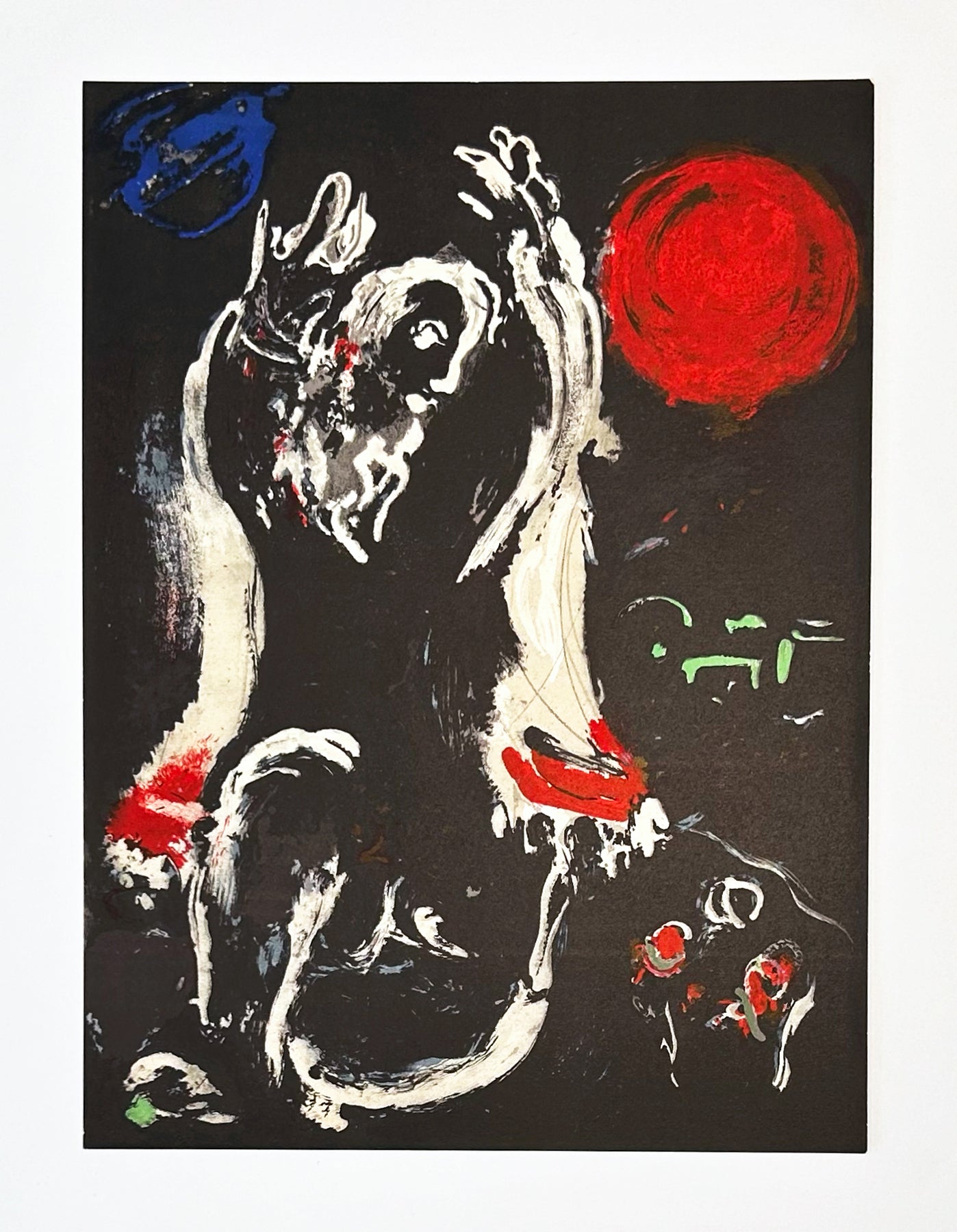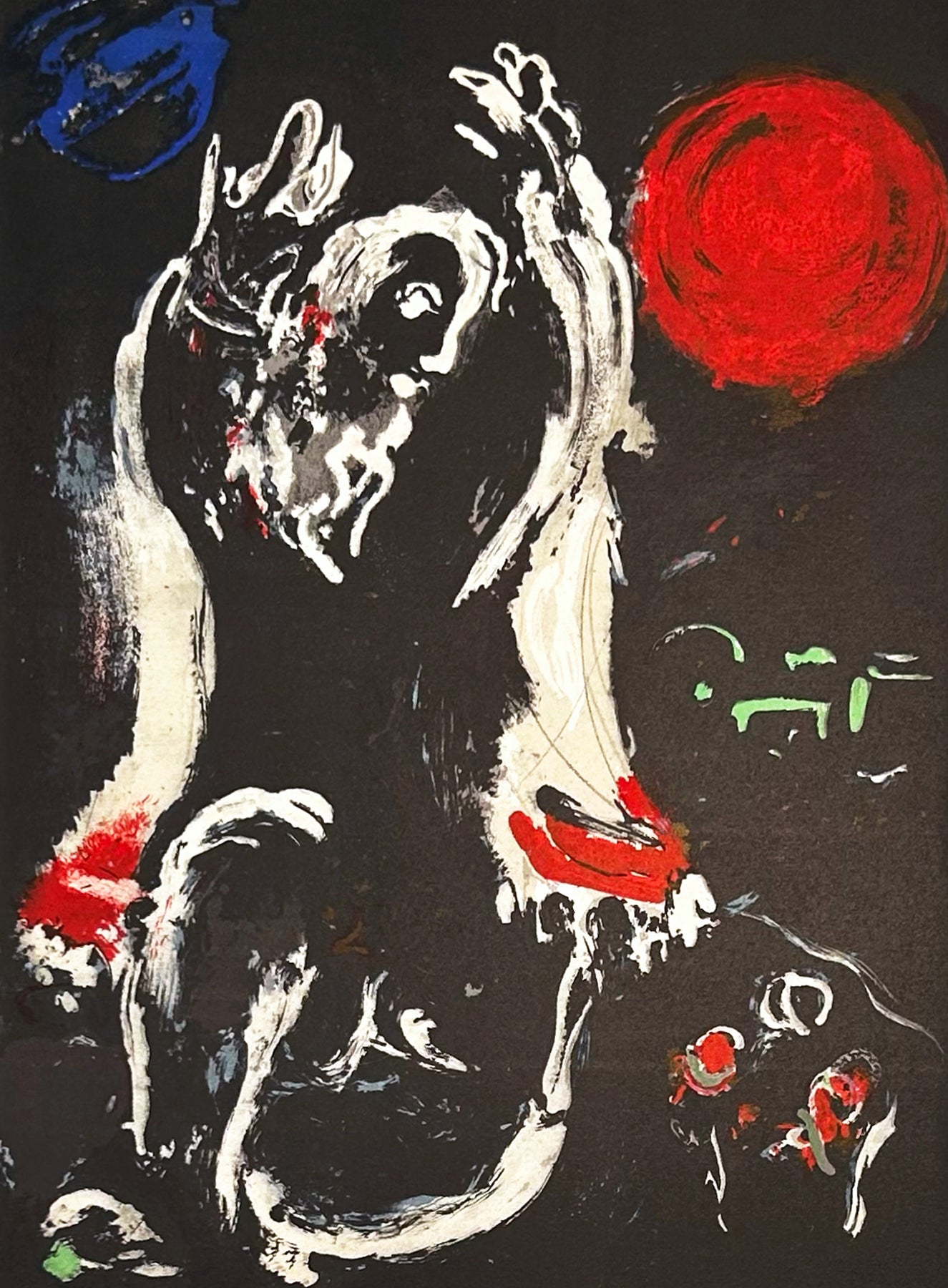 Marc Chagall was born in Vitebsk, Byelorussia, in 1887 to a poor Hasidic family. The eldest of nine children, Marc Chagall studied first in a heder before moving to a secular Russian school, where he began to display his artistic talent. With his mother's support, and despite his father's disapproval, Chagall pursued his interest in art, going to St. Petersburg in 1907 to study art with Leon Bakst. Influenced by contemporary Russian painting, Chagall's distinctive, child-like style, often centering on images from his childhood, began to emerge. From 1910 to 1914, Marc Chagall lived in Paris, and there absorbed the works of the leading cubist, surrealist, and fauvist painters. It was during this period that Chagall painted some of his most famous paintings of the Jewish shtetl or village, and developed the features that became recognizable trademarks of his art. Strong and often bright colors portray the world with a dreamlike, non-realistic simplicity, and the fusion of fantasy, religion, and nostalgia infuses his work with a joyous quality. Animals, workmen, lovers, and musicians populate his figures; the "fiddler on the roof" recurs frequently, often hovering within another scene. Chagall's work of this period displays the influence of contemporary French painting, but his style remains independent of any one school of art. He exhibited regularly in the Salon des Independants. In 1914, before the outbreak of World War I, Marc Chagall held a one-man show in Berlin, exhibiting work dominated by Jewish images and personages. During the war, he resided in Russia, and in 1917, endorsing the revolution, he was appointed Commissar for Fine Arts in Vitebsk and then director of the newly established Free Academy of Art. The Bolshevik authorities, however, frowned upon Chagall's style of art as too modern, and in 1922, Marc Chagall left Russia, settling in France one year later. He lived there permanently except for the years 1941 - 1948 when, fleeing France during World War II, he resided in the United States. Chagall's horror over the Nazi rise to power is expressed in works depicting Jewish martyrs and Jewish refugees. In addition to images of the Hassidic world, Chagall's paintings are inspired by themes from the Bible. His fascination with the Bible culminated in a series of over 100 etchings illustrating the Bible, many of which incorporate elements from Jewish folklore and from religious life in Vitebsk. Chagall's other illustrations include works by Gogol, La Fontaine, Y. L. Peretz, and his autobiographical Ma Vie (1931; My Life 1960) and Chagall by Chagall (1979) Marc Chagall painted with a variety of media, such as oils, water colors, and gouaches. His work also expanded to other forms of art, including ceramics, mosaics, and stained glass. Among his most famous building decorations are the ceiling of the Opera House in Paris, murals at the New York Metropolitan Opera, a glass window at the United Nations, and decorations at the Vatican Israel, which Marc Chagall first visited in 1931 for the opening of the Tel Aviv Art Museum, is likewise endowed with some of Chagall's work, most notably the twelve stained glass windows at Hadassah Hospital and wall decorations at the Knesset. Marc Chagall received many prizes and much recognition for his work. He was also one of very few artists to exhibit work at the Louvre in their lifetime. Marc Chagall's involvement with printmaking dates to 1922 and his return to Berlin after World War I. In the course of trying to recover the paintings he had left behind with Sturm Gallery's director Herwarth Walden in 1914, Walter Feilchenfeldt, the director of the Cassirer Gallery, offered to publish Chagall's then recently completed autobiography Mein Leben (My Life) to be illustrated with etchings. Although the book was never published due to translation problems, a suite of 20 etchings was created by the artist in the medium of dry-point etching depicting scenes and figures in Chagall's newly evolved naïve-realistic style. Chagall had never before been introduced to printmaking techniques and became very enamored with them, trying his hand with woodcuts and lithography, too. He felt that in these mediums his narrative flair had found its proper expression. Chagall wrote in 1960, "Since I started using a pencil, I have sought for this certain something that could spread like a stream toward unknown and alluring shores." And again, "When I held a lithographic stone or a copperplate in my hand I thought I was touching a talisman. It seemed to me that I could put all my joys and sorrows in it....Everything that touched my life through the years, births, deaths, weddings, flowers, animals, birds, the poor workers, my parents, lovers in the night, the biblical prophets, on the street, at home, in the temple and in heaven. And as I grew older, the tragedy of life within us and around us."1 It is in this sense that Chagall did lithographs, and they have become the stream that carries the message of his painting into the wide world. Fortuitously, it was a printmaking commission that brought Marc Chagall back to Paris in 1923. The famous dealer and editor, Ambroise Vollard, invited him to do some book illustrations and the artist requested the book be the Russian author Gogol's Dead Souls. So it was that Marc Chagall engraved 107 etchings on this theme in the course of only two years. Although in style they are related to the Mein Leben dry-points, their technique is obviously more elaborate and refined. Indicative of how the various creative mediums are related, the artist found that in the process of developing engraved imagery to illustrate Gogol he was able to revive his own Russian themes. As he had been longing to surround himself with the paintings he had lost in the course of WWI and his sojourn in Russia, he seized upon this inspiration to reconstruct many of his earlier missing canvasses. Other themes also evolved that were connected to his more recent Mo